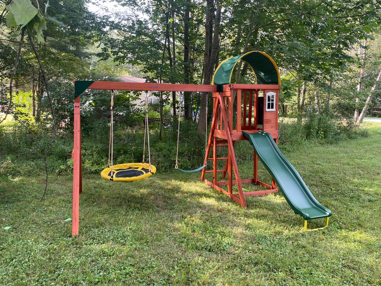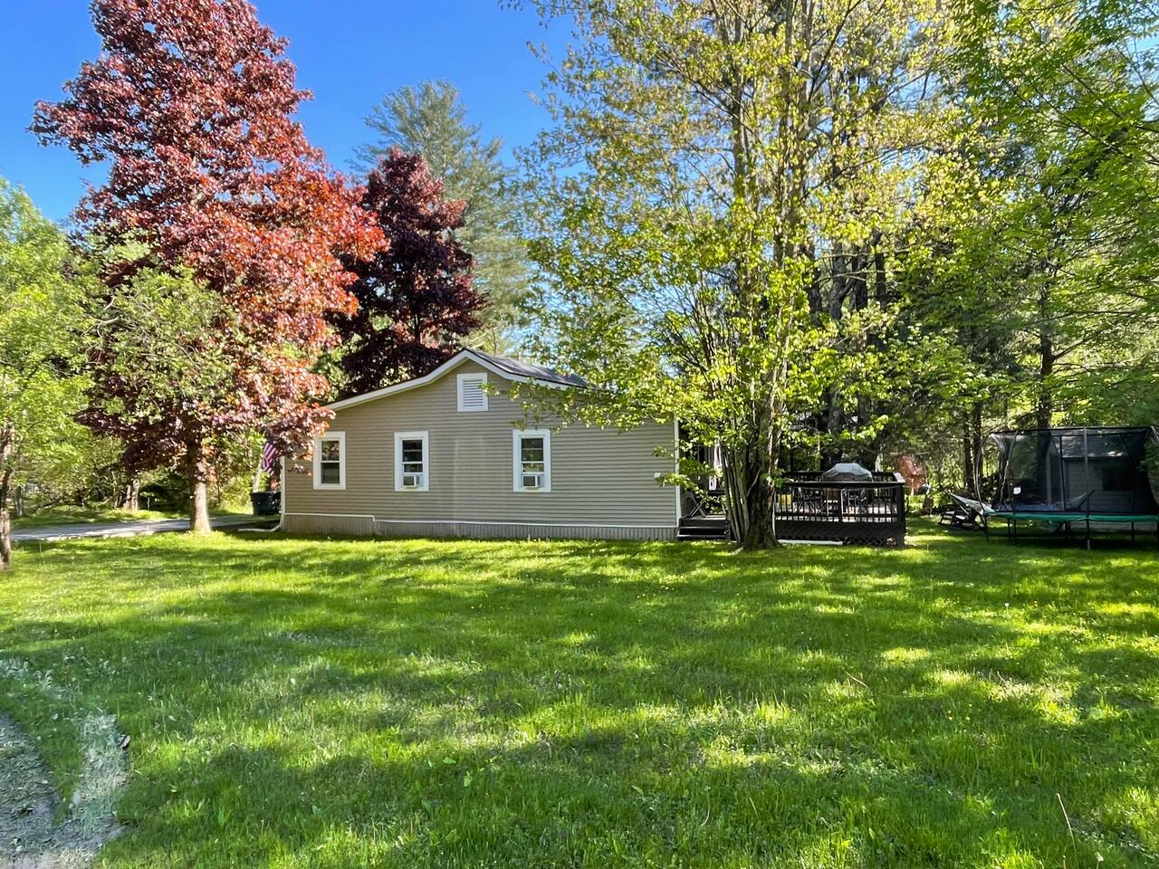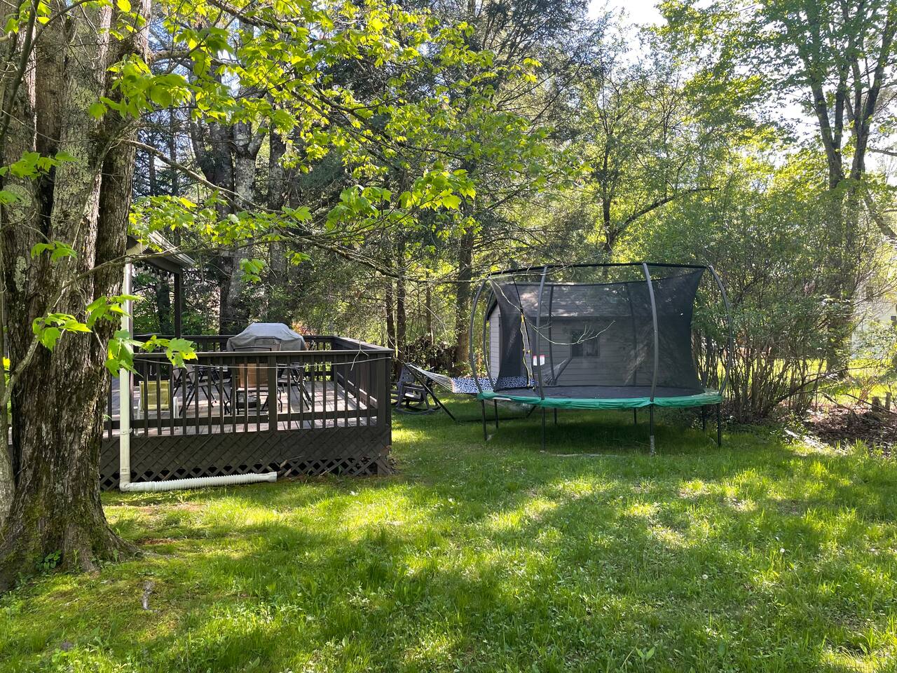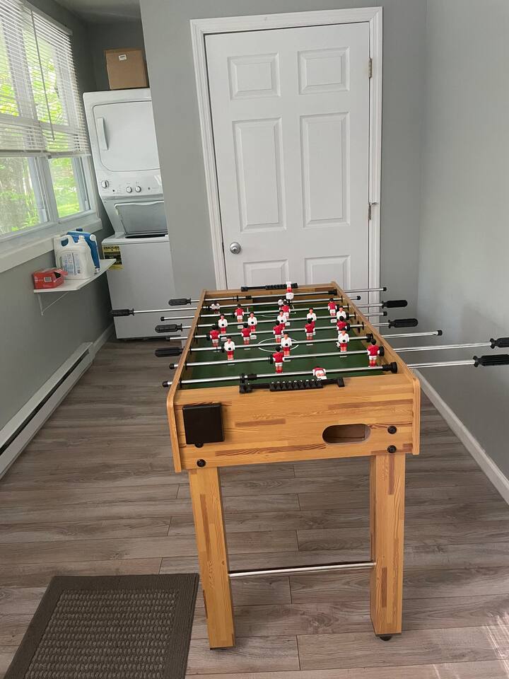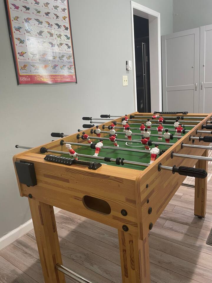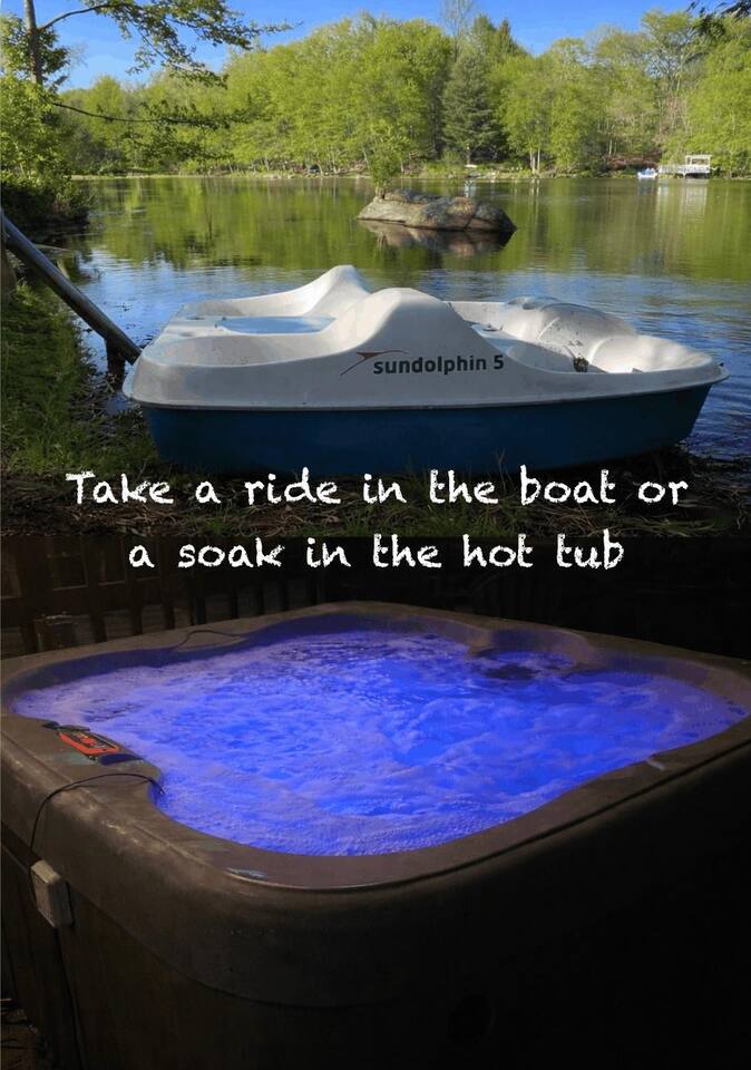 Enjoy all the comforts of home at this clean and beautifully renovated Catskill Mountain cabin, located in a small and friendly lake community. The house was recently gut renovated with a focus on space and comfort. We are continuously upgrading/ adding amenities to ensure an excellent stay. No need to pack up your entire house- we provide clean towels, linen, and basic kitchen necessities as well as soap, shampoo and a washer/dryer. We have excellent Wi-Fi and multiple laptop friendly workspaces. Out front there is a carport with space for at least two vehicles, as well as additional spots on the grass. Walk up a few steps to the front porch and into the front door. There is a spacious living room with two comfortable couches with two built-in recliners. Enjoy the game or access your subscriptions (Netflix, Hulu, Amazon etc.) on the 50" smart, flat-screen TV. We have an assortment of books, games and children's toys as well as brochures for local points of interest. In the kitchen we have a stainless steel fridge and powerful convection oven, as well as a toaster oven, microwave and bread toaster. basic pots, pans and utensils. We have a full set of cutlery, mugs and dishware. We also provide a Keurig coffee maker with a selection of K-cups, tea bags, sugar and creamer. The dining room table offers seating for six. There are three bedrooms in the house. Each one has a window air conditioner during the warm months and storage space. The mattresses, pillows and blankets are super comfortable, and each room has black-out shades, helping you to a great night's sleep even away from home. Master Bedroom: Offers a king-sized bed, nightstand and closet with a chest of drawers. There is an iron/ironing board and an extra fan in the closet. There is also a ceiling fan above the bed. Bedroom 2: This room is great for adults or kids. There is a bunk bed with a full-size mattress on bottom and twin mattress on top. In the closet you can find the life jackets, tv dinner/laptop tables and a rail for the lower bunk in case you have young children. Sorry, no ceiling fan in this room, we value your head. Bedroom 3: This room has two twin beds with a nightstand in-between, and a bureau with hanging space and drawers in which you can find extra towels and blankets. This room also has a ceiling fan. The bathroom has extra toiletries in the medicine cabinet and there is a hair iron under the sink. There is a tub and shower. The back room is a great bonus space with a foosball table and washer/dryer. The back deck is a great place to relax with a table and chairs located next to the BBQ grill. We provide grill utensils. On the lawn we have chairs around a fire pit, perfect for outdoor cooking, smores-making or warming up in the colder months Hot Tub all year round . Enjoy endless stars under the clear mountain sky. We have Adirondack rockers and a hammock out in the summer months. There is baseboard heating throughout the house, with an individual thermostat in each room. There is also a 24,000 BTU split system located in the dining area which can provide extra cooling or heating during extreme temperatures. On the side of the house, we have a fire pit, a large trampoline, basketball hoop and a playground for the kids. We have an infant bathtub, pack-n-play, and toddler booster seat always available at the house. The 4+ acre lake is located just a few hundred steps from the house and is a wonderful place to play or relax. It is accessed via a community beachfront area. The beachfront area (grass, not sand) has a picnic table for lakeside dining. The lake allows non-motorized boating and activities and is stocked with an array of fish for catch and release fishing. The lake is less than 6' deep in most spots and is great for swimming. There is a dock in the middle during warmer months, perfect for lounging on or for jumping into the lake. We have a pedal boat that you can use, instructions can be found in the house manual. The lake usually freezes over during the winter, allowing for ice skating, ice fishing or tubing. Please make sure it is frozen solid before walking on it! Pets are allowed case by case, please let us know in advance if you plan to bring one. If you bring a pet, an extra $25 cleaning fee will be charged after booking. We strive to make your stay as relaxing and comfortable as possible. We have a caretaker in the community and live nearby in case anything is needed. We always listen to suggestions to keep improving the house and the supplies that we offer. Our guidebook offers recommendations for local restaurants, activities and attractions. We look forward to hosting your stay!