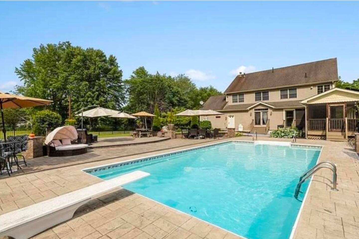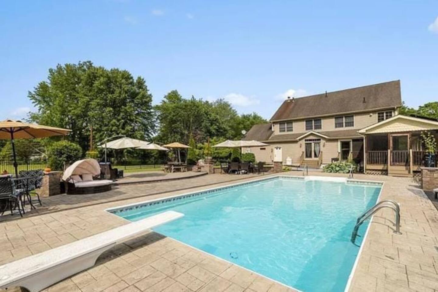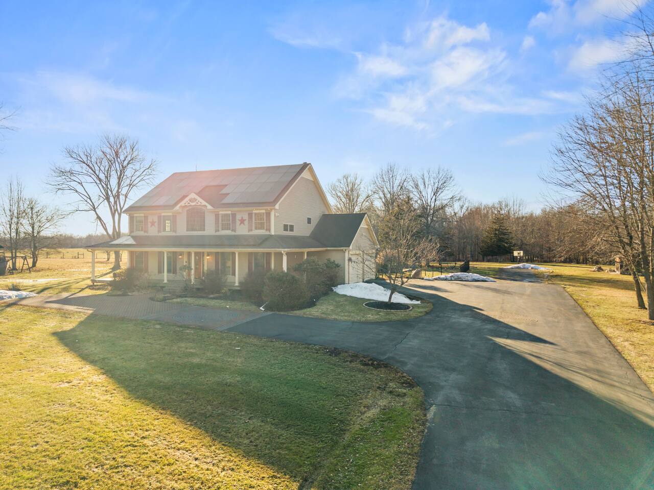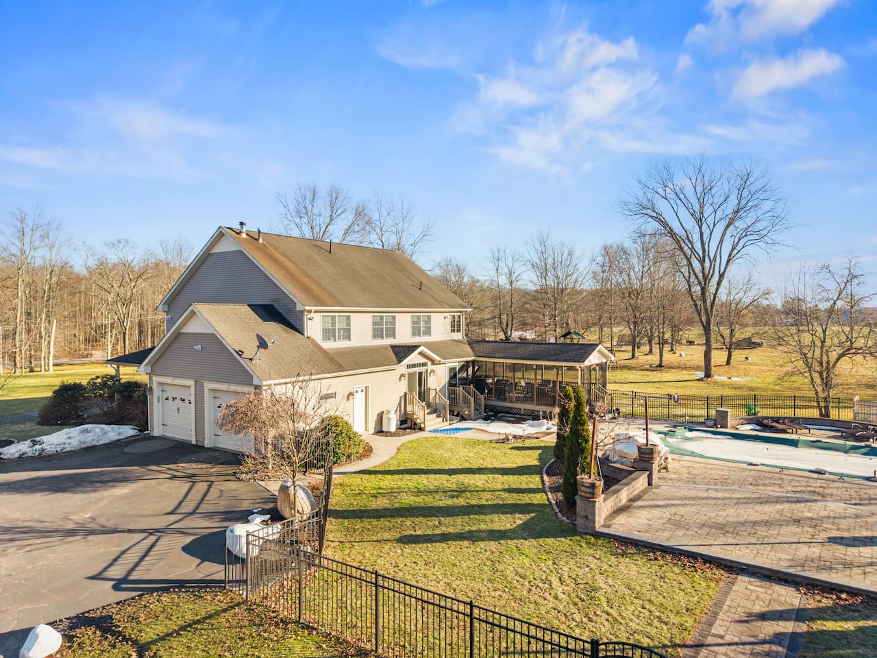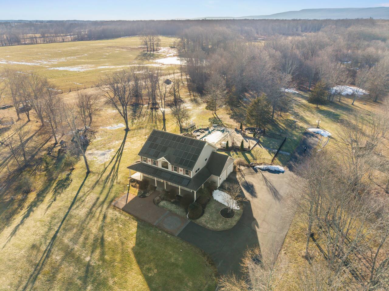 Spacious Hudson Valley retreat in Gardiner, NY perfect for large families and groups. This home features 8 bedrooms, 3.5 bathrooms, and sleeps up to 28 guests comfortably. Enjoy the pool, hot tub, fire pit, gym, and game room with pool table. The home also offers a large kitchen with wine fridge, dining area, cozy living room with fireplace, basketball hoop, grill, outdoor TV by the hot tub, dedicated workspace, jetted tub, and laundry room with washer and dryer.