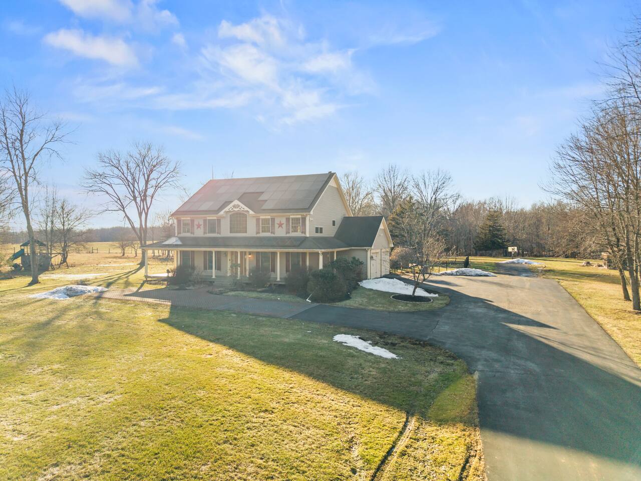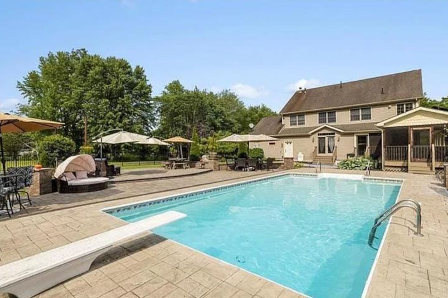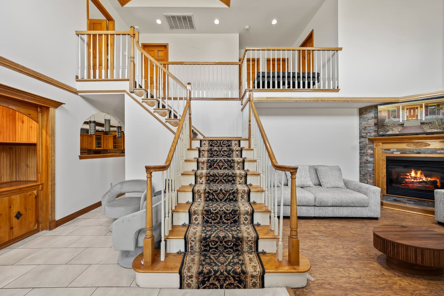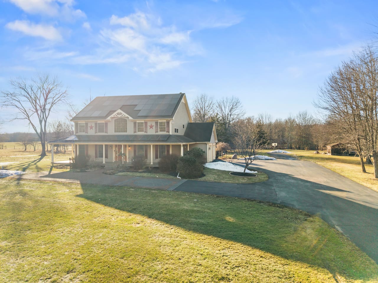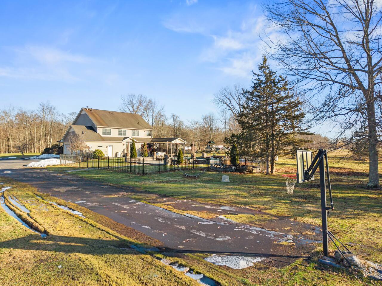 Spacious Hudson Valley retreat in Gardiner, NY perfect for large families and groups. This home features 8 bedrooms, 3.5 bathrooms, and sleeps up to 28 guests comfortably. Enjoy the pool, hot tub, fire pit, gym, and game room with pool table. The home also offers a large kitchen with wine fridge, dining area, cozy living room with fireplace, basketball hoop, grill, outdoor TV by the hot tub, dedicated workspace, jetted tub, and laundry room with washer and dryer.