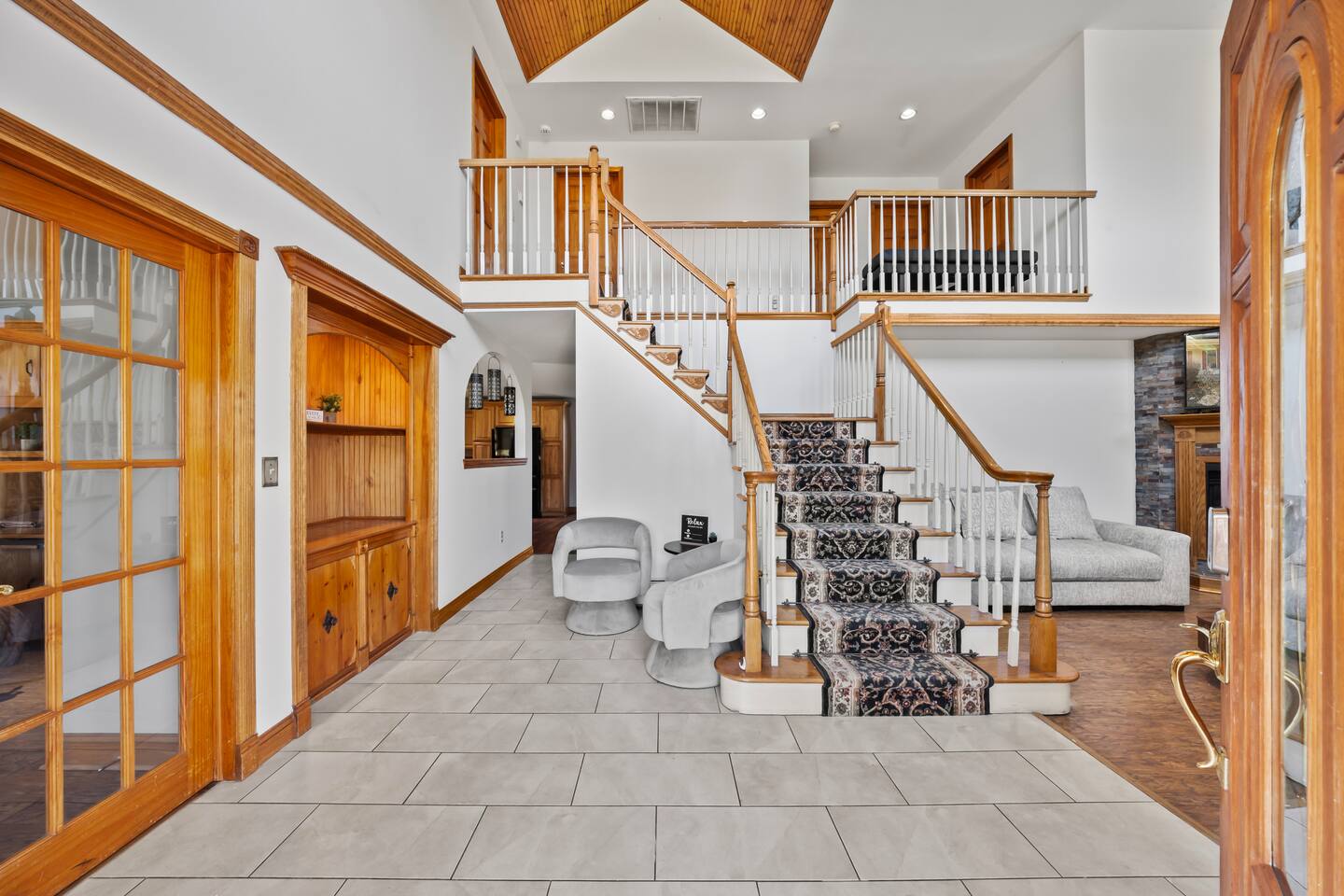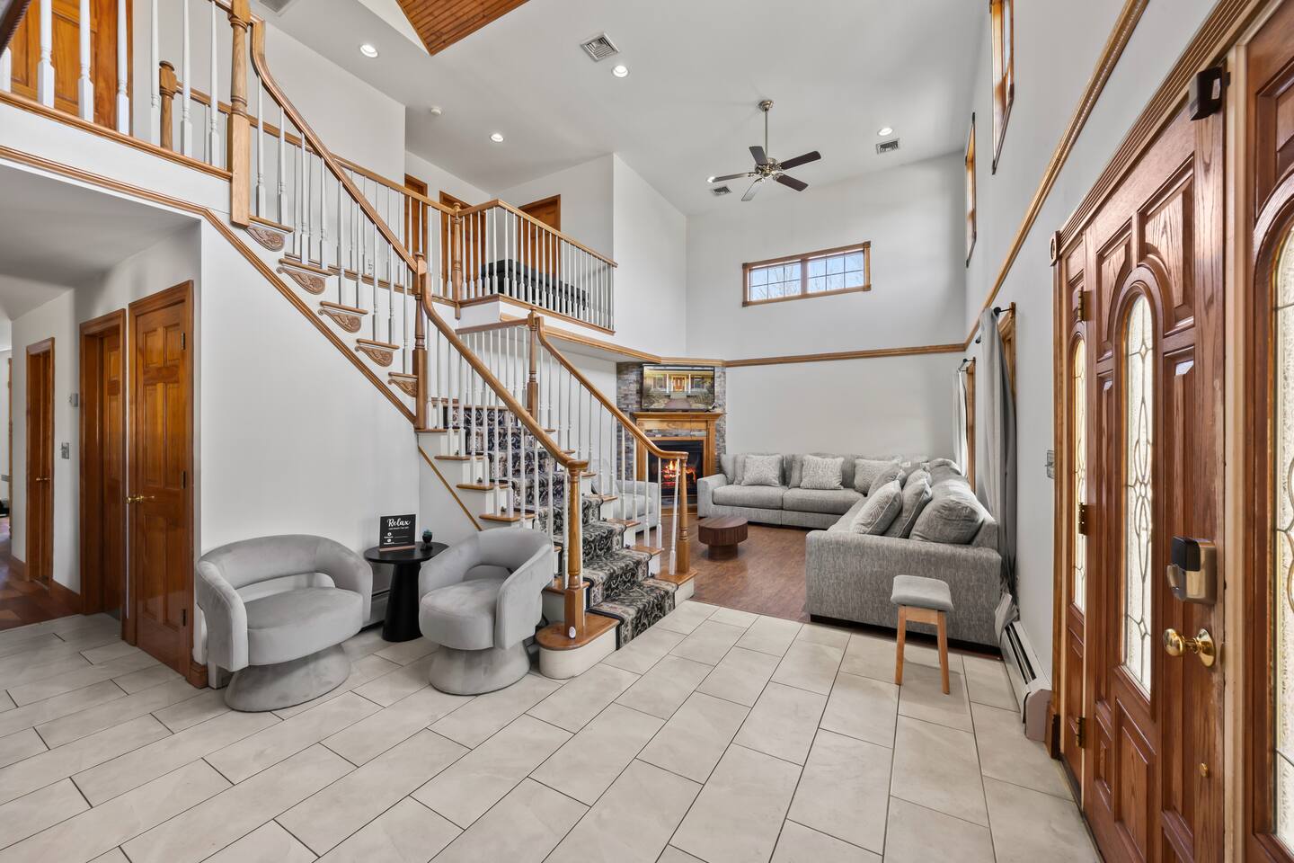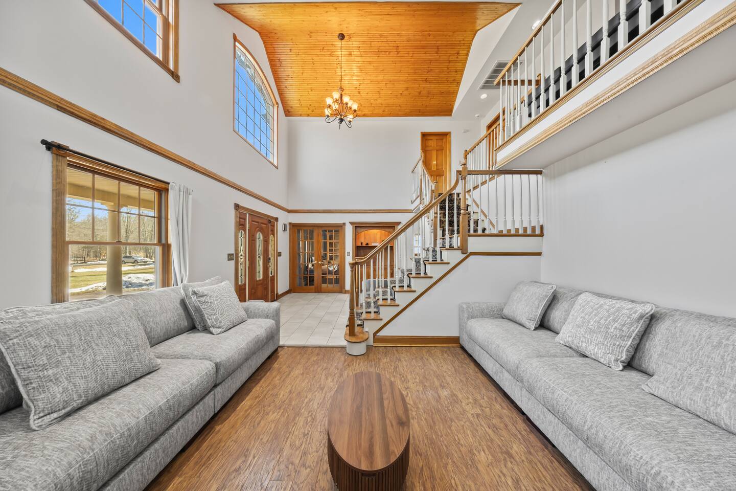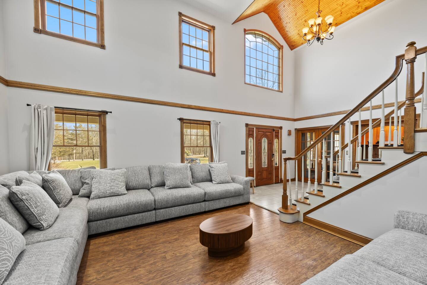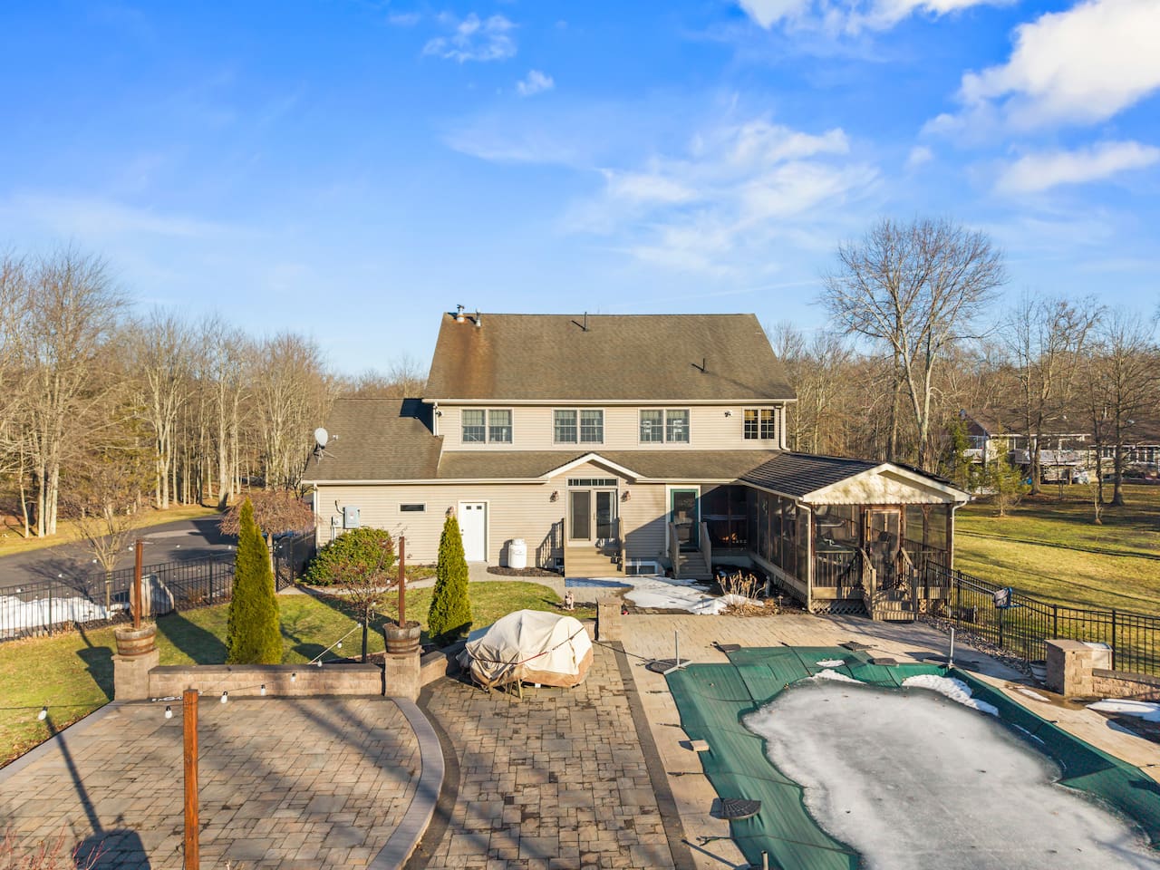 Spacious Hudson Valley retreat in Gardiner, NY perfect for large families and groups. This home features 8 bedrooms, 3.5 bathrooms, and sleeps up to 28 guests comfortably. Enjoy the pool, hot tub, fire pit, gym, and game room with pool table. The home also offers a large kitchen with wine fridge, dining area, cozy living room with fireplace, basketball hoop, grill, outdoor TV by the hot tub, dedicated workspace, jetted tub, and laundry room with washer and dryer.