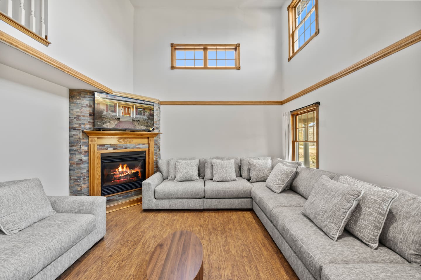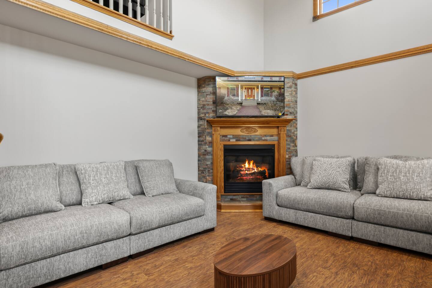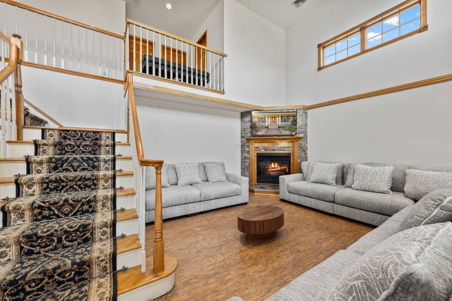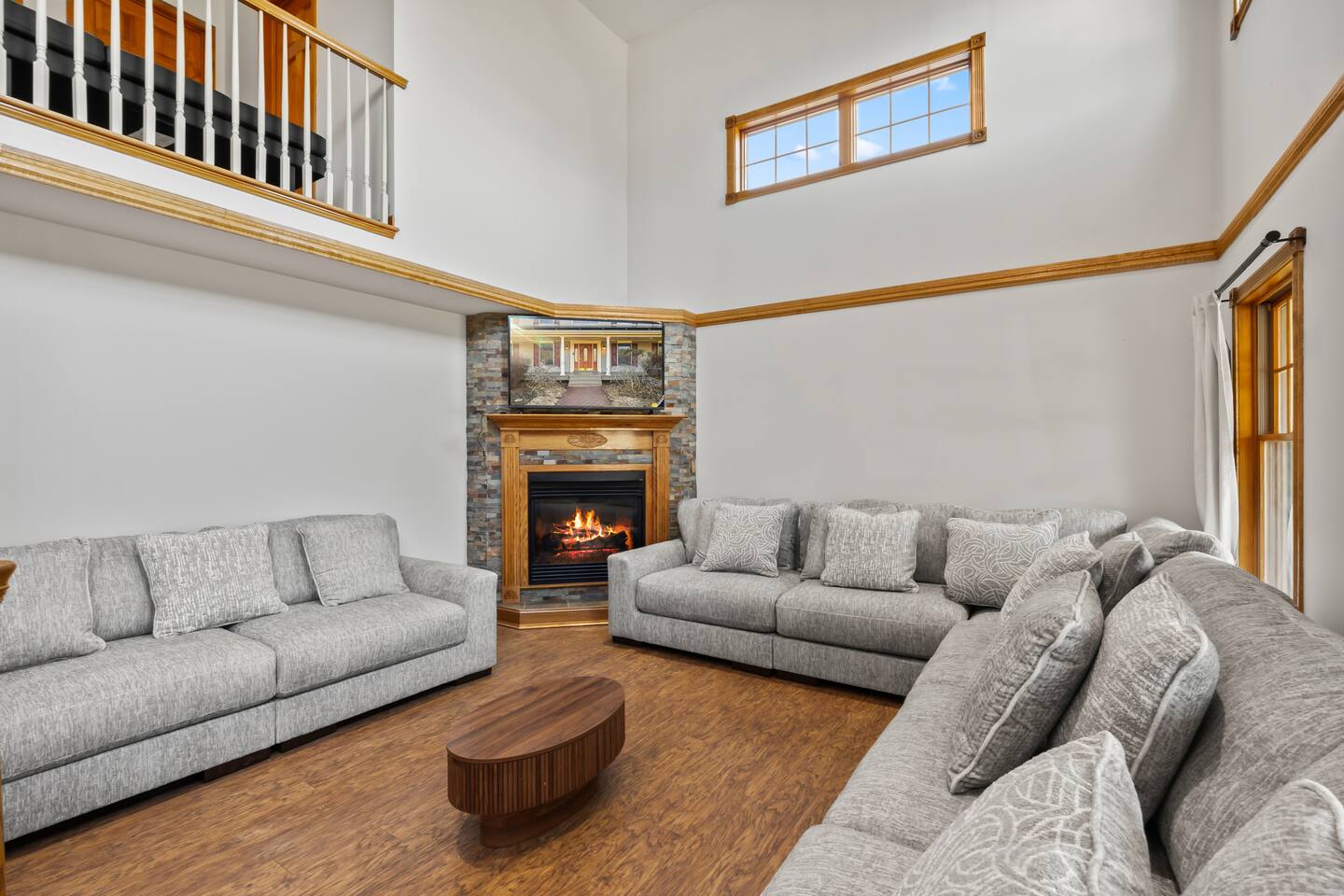 This spacious home is designed to comfortably accommodate large groups with multiple levels and plenty of room to gather or relax. With 8 bedrooms and 23 beds, the home can comfortably sleep up to 28 guests, making it ideal for family gatherings and group getaways. The main floor features a fully equipped kitchen with a wine fridge, a large dining room perfect for group meals, and a bright living room with a cozy fireplace. This level also includes one bedroom and a bathroom. Upstairs, you’ll find four additional bedrooms and two bathrooms, providing comfortable sleeping space for families and groups. One of the bathrooms features a relaxing jetted tub. The lower level includes three more bedrooms, a bathroom, and a game room with a pool table, creating a great space for entertainment and relaxation. The home also includes a dedicated workspace, a laundry room with washer and dryer, and a gym area. Outside, guests can enjoy the pool, hot tub with outdoor TV, fire pit, grill, basketball area, and outdoor seating, making it easy to relax and spend time together both indoors and outdoors.