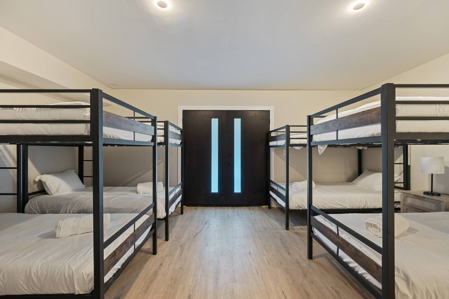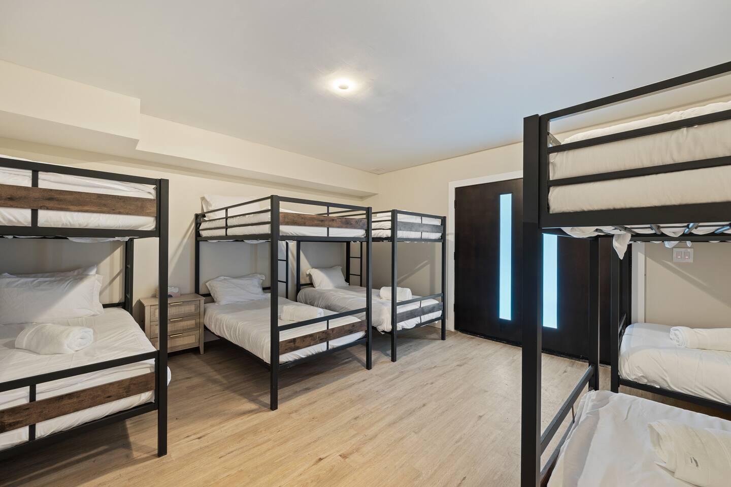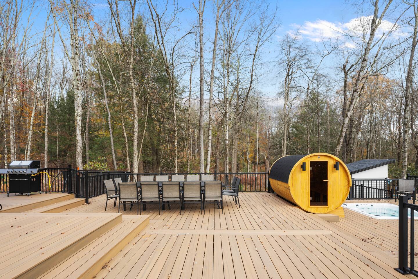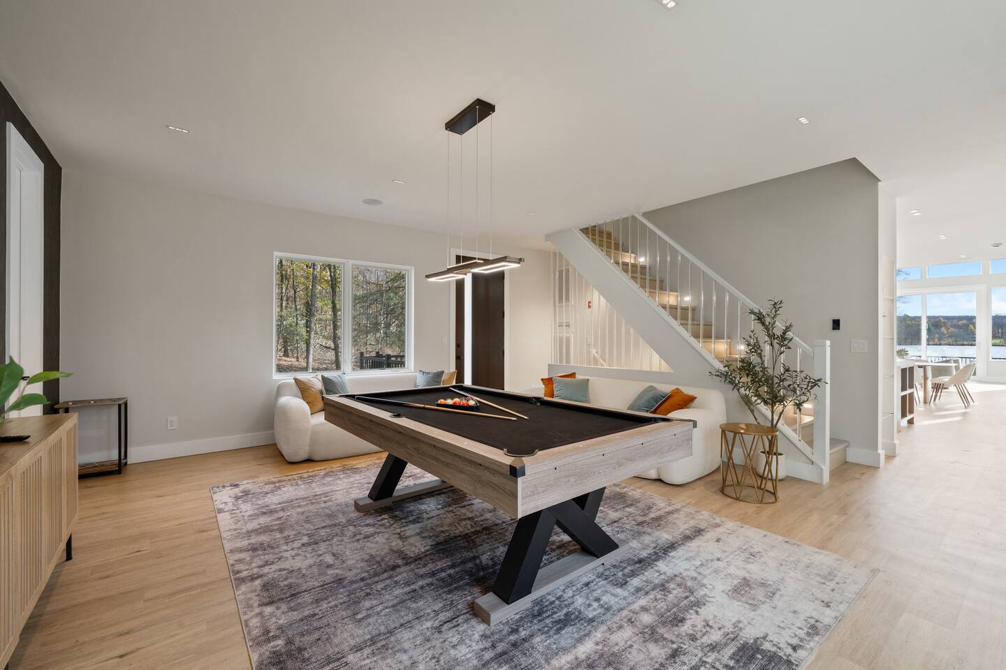 Welcome to Lakefront Paradise, a stunning 8-bedroom, 5-bath lakefront estate surrounded by nature and complete privacy. The main floor features a bright open-concept kitchen, dining, and living area with breathtaking lake views, plus a game room with a pool table and a guest suite. The second floor offers a serene master suite with a soaking tub, walk-in closet, and three additional bedrooms. The basement includes a spacious recreation area with game tables, monkey bars, and three bedrooms — ideal for families or large groups. Step outside to your private pool, hot tub, sauna, kayaks, playground, trampoline, and a huge deck overlooking the lake — perfect for dining, relaxing, or watching the sunset.