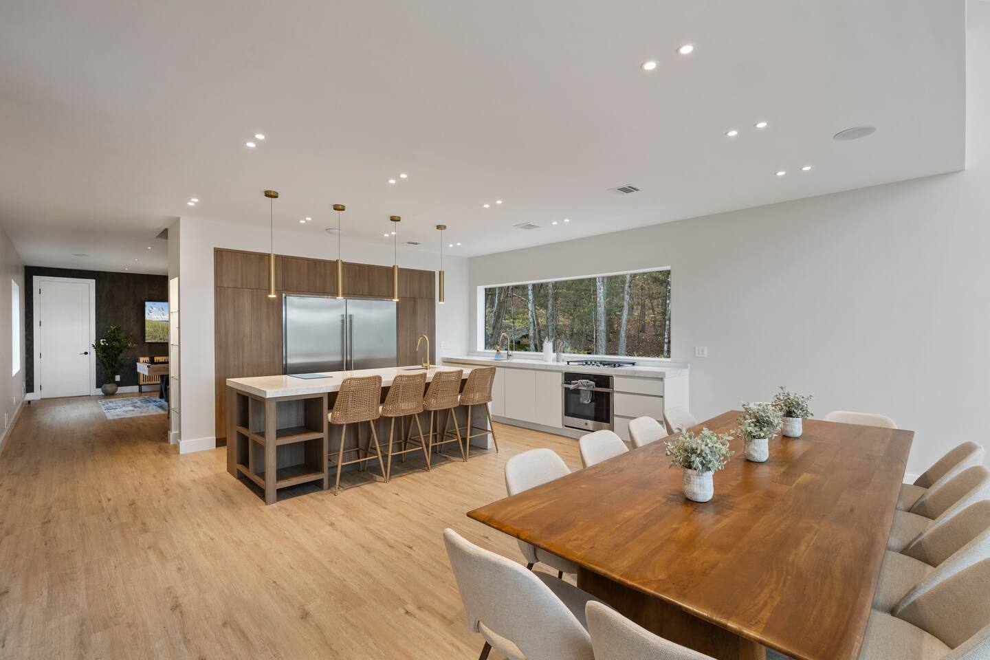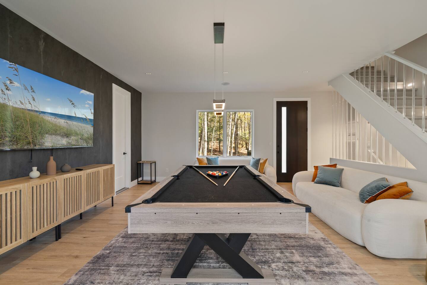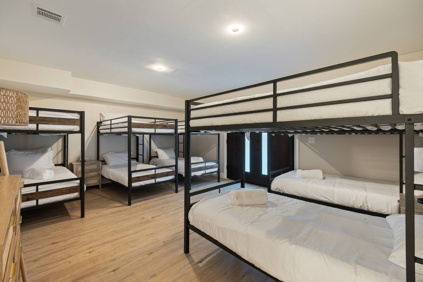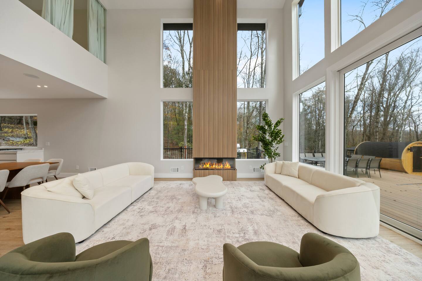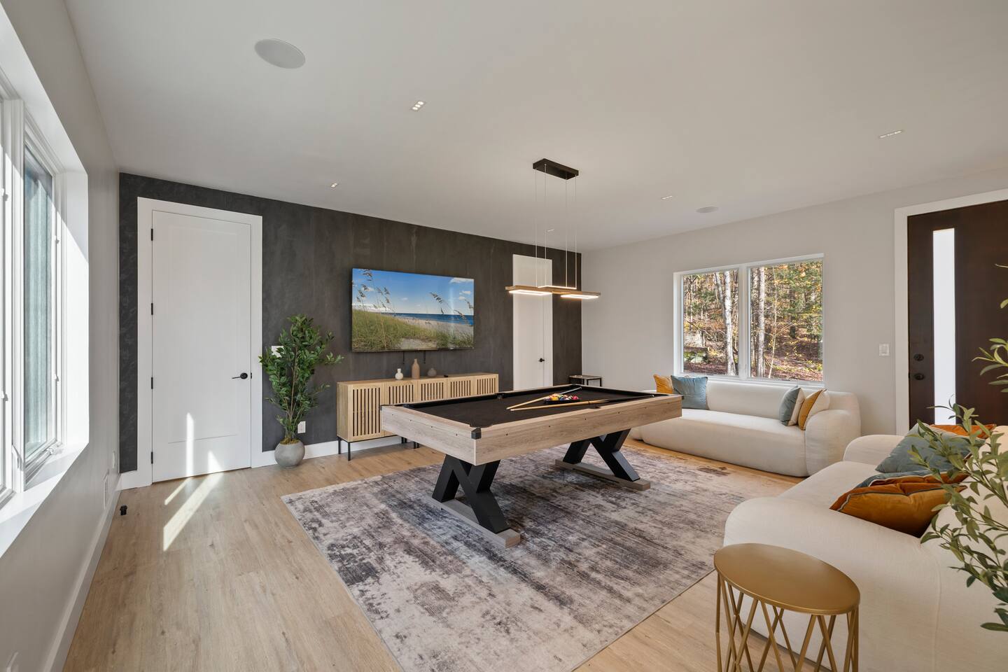Welcome to Lakefront Paradise, a stunning 8-bedroom, 5-bath lakefront estate surrounded by nature and complete privacy. The main floor features a bright open-concept kitchen, dining, and living area with breathtaking lake views, plus a game room with a pool table and a guest suite. The second floor offers a serene master suite with a soaking tub, walk-in closet, and three additional bedrooms. The basement includes a spacious recreation area with game tables, monkey bars, and three bedrooms — ideal for families or large groups. Step outside to your private pool, hot tub, sauna, kayaks, playground, trampoline, and a huge deck overlooking the lake — perfect for dining, relaxing, or watching the sunset.