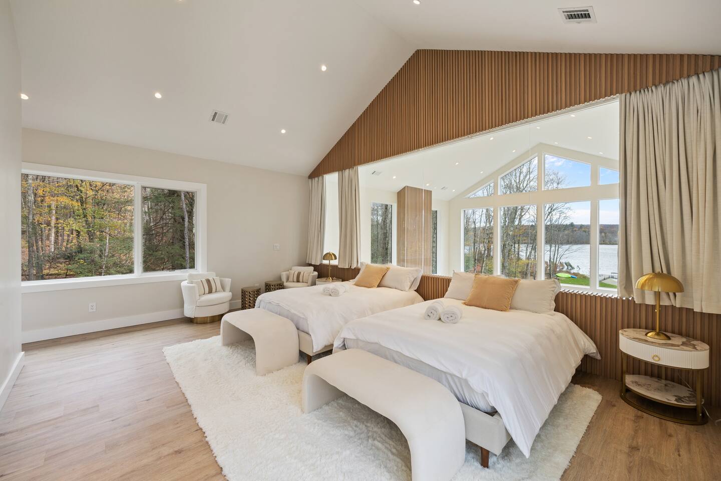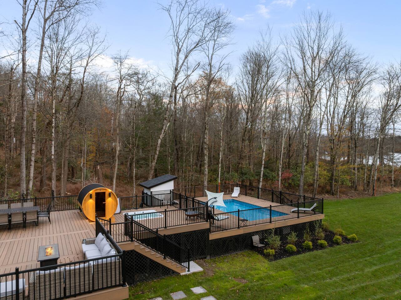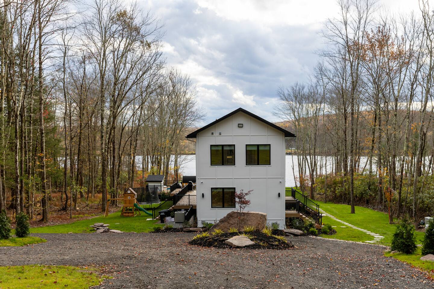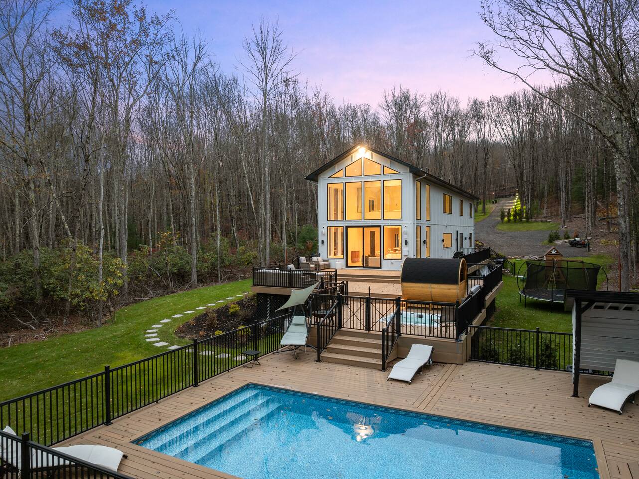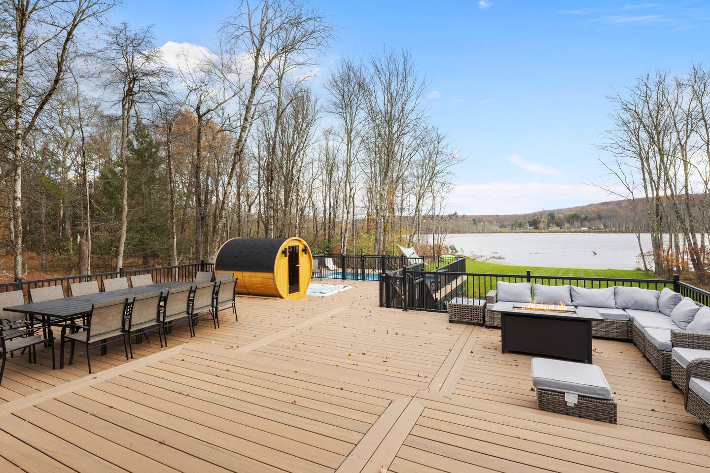 Escape to Lakefront Paradise, a private luxury retreat on a secluded lake in Woodridge, NY. Enjoy a pool, hot tub, sauna, and direct lake access with kayaks. The open-concept kitchen and living room feature panoramic lake views, while the spacious deck, playground, and trampoline create endless outdoor fun. Perfect for families and groups seeking relaxation, adventure, and total privacy.