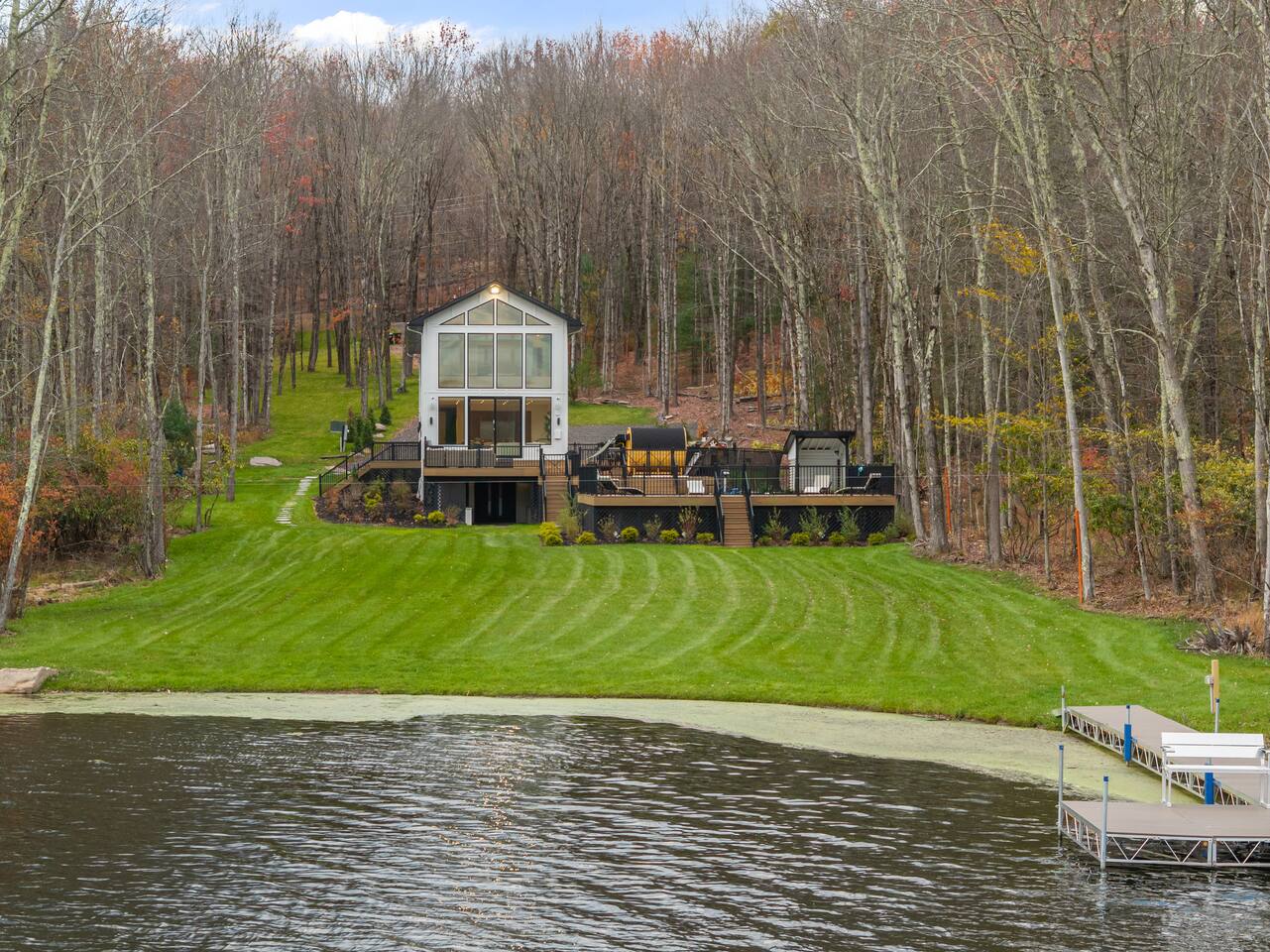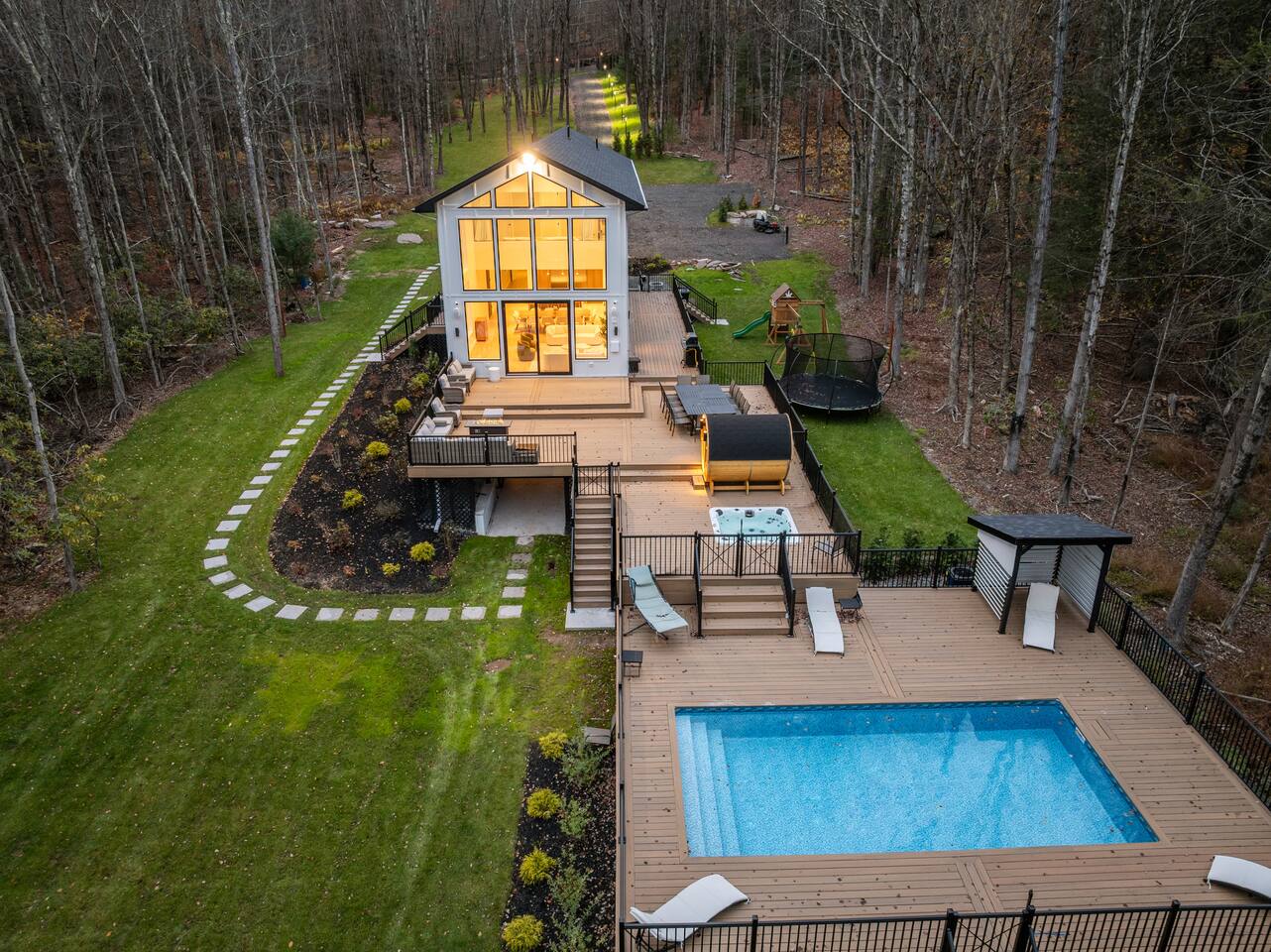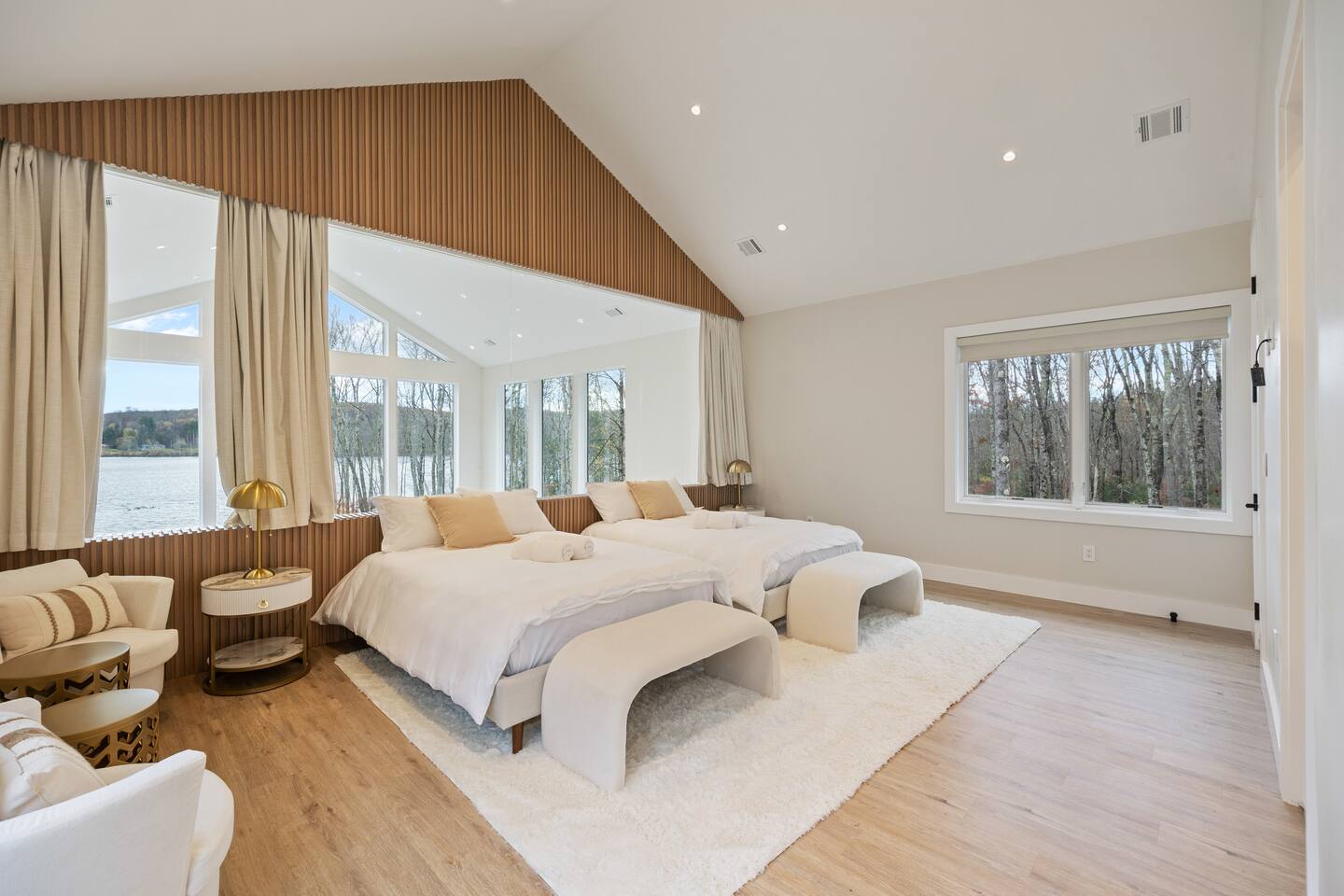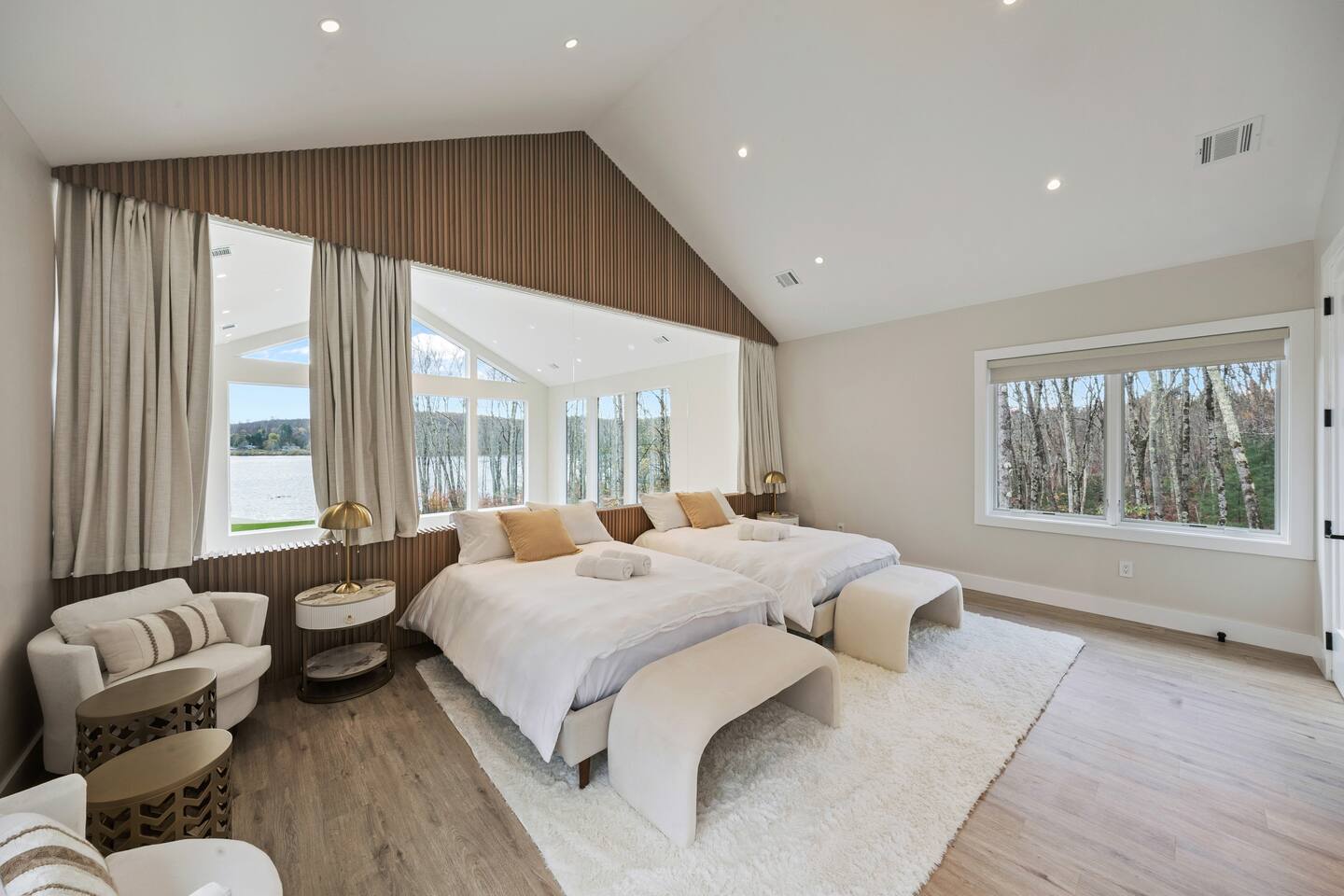 Escape to Lakefront Paradise, a private luxury retreat on a secluded lake in Woodridge, NY. Enjoy a pool, hot tub, sauna, and direct lake access with kayaks. The open-concept kitchen and living room feature panoramic lake views, while the spacious deck, playground, and trampoline create endless outdoor fun. Perfect for families and groups seeking relaxation, adventure, and total privacy.