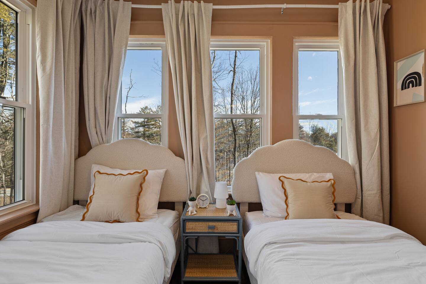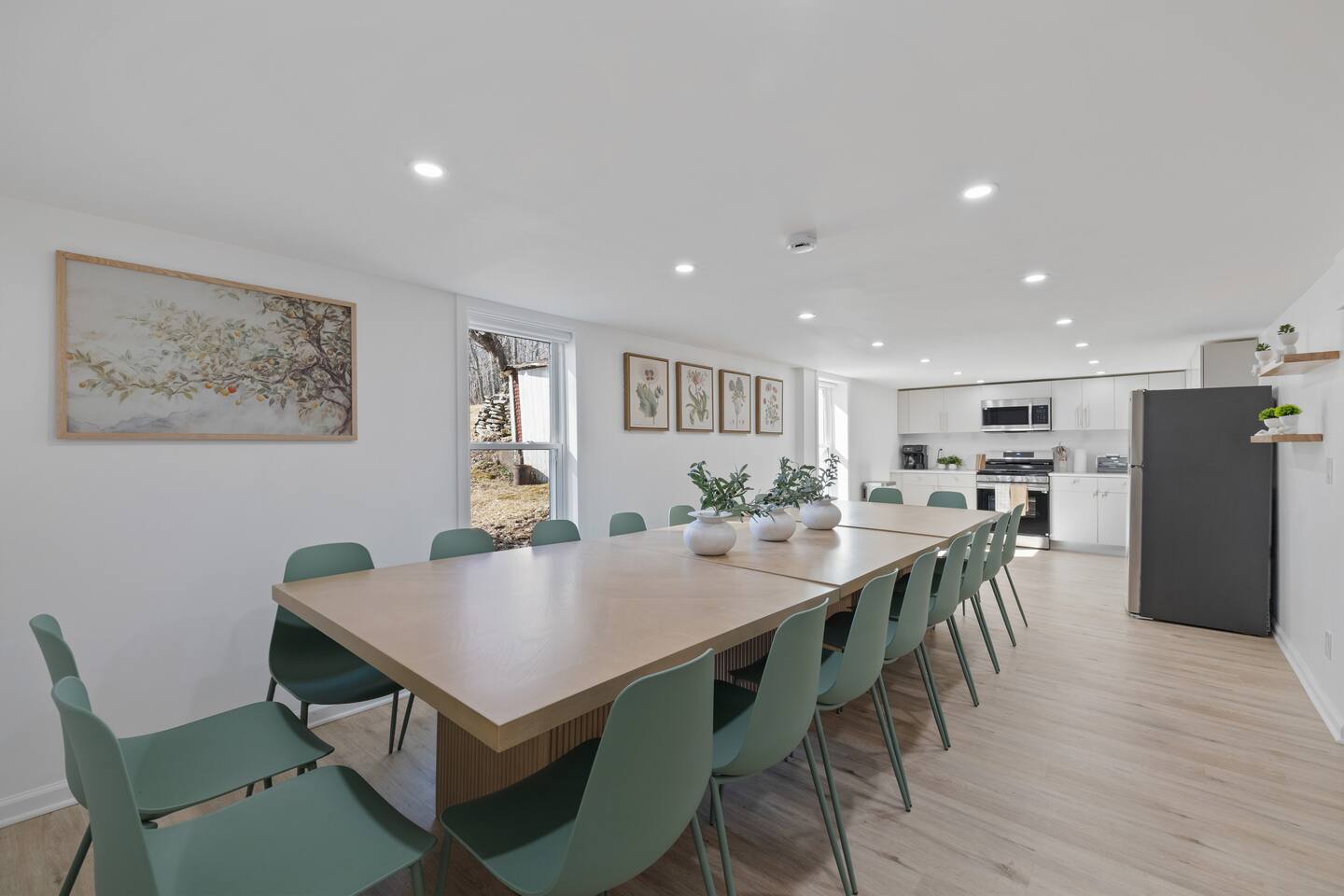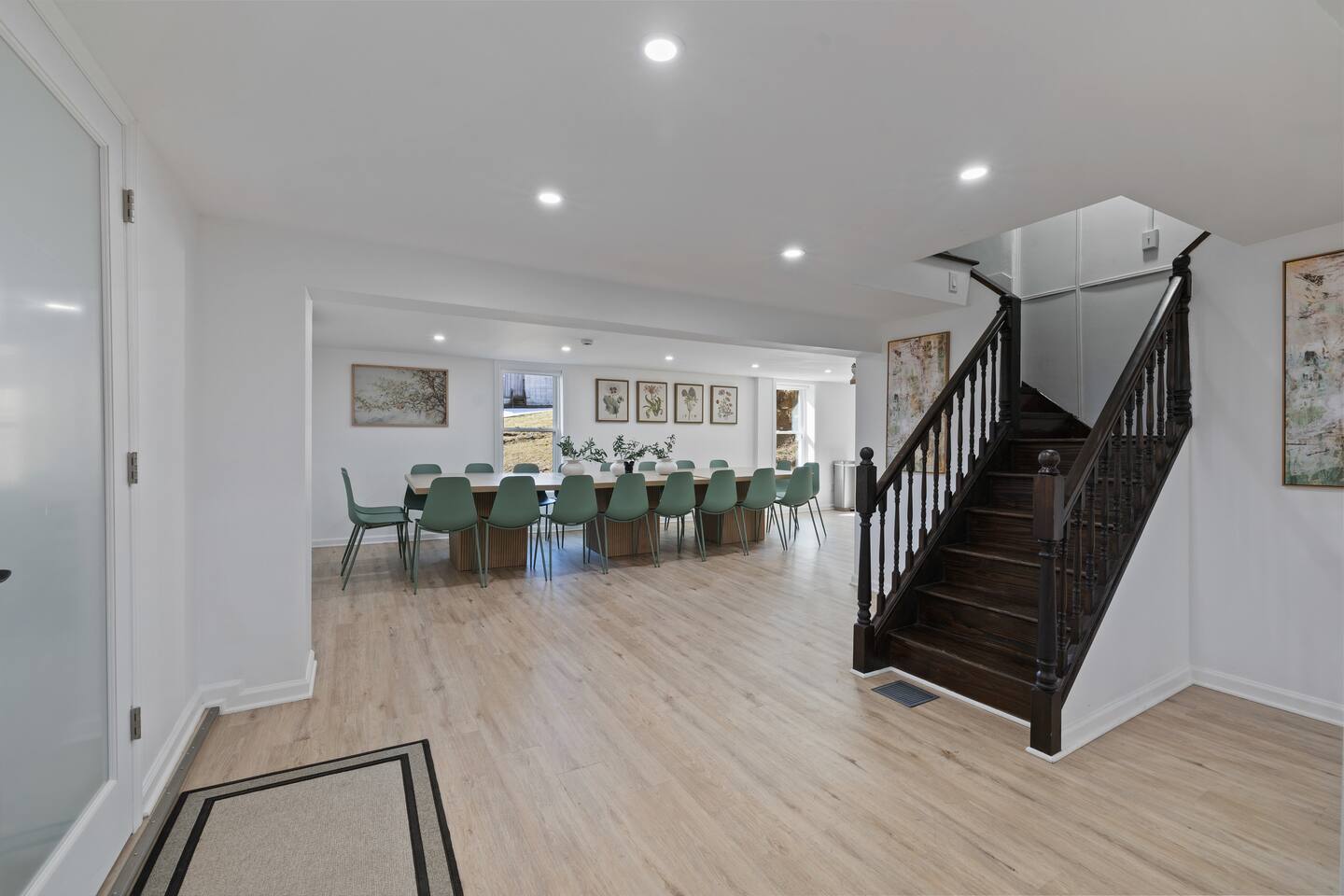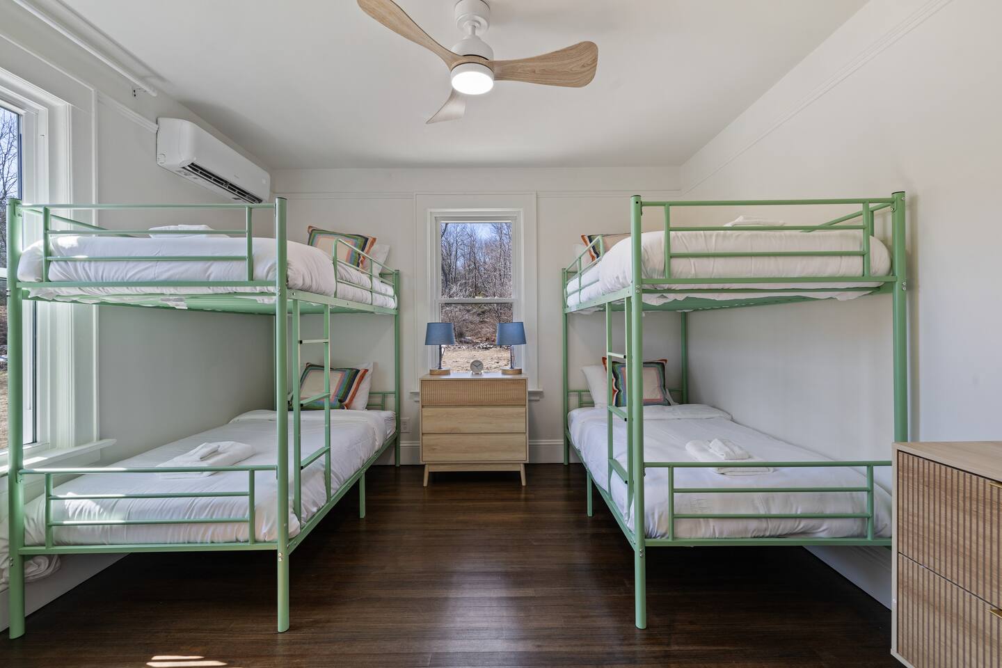 First Floor: Step into a warm and inviting space featuring a cozy living room, a dining area perfect for shared meals, and a fully equipped kitchen stocked with everything you need. A mudroom and laundry room with a washer and dryer add extra convenience, and a half bathroom completes this level. Second Floor: This floor offers two lounge areas, each with a sofa bed, perfect for relaxing or additional sleeping space. You'll find: A room with two twin beds. A room with two full-size beds and a full bathroom, leading into another room with a full-size beds. A red room with a queen-size bed and a private full bathroom, which connects to a room with a twin-on-twin bunk beds. An additional room with a twin bed. Please note: Two back bedrooms on this floor require passage through adjacent rooms for access. Third Floor: This floor also features two lounge areas, each with a sofa bed for extra sleeping space. You'll find: A room with two twin-on-twin bunk beds. A lounge area with a full bathroom and a sofa bed, leading into a room with a queen-size bed. A room with two twin beds. Another lounge area with a full bathroom and a sofa bed, leading into a bedroom with two full-size beds. This spacious home is designed to accommodate groups comfortably, ensuring a memorable and relaxing stay. We look forward to hosting you!