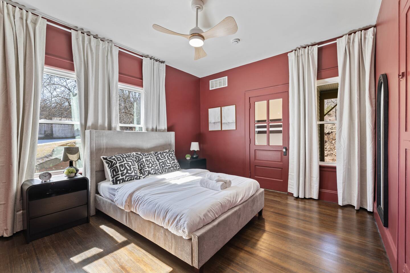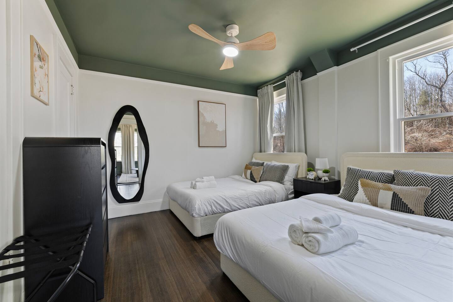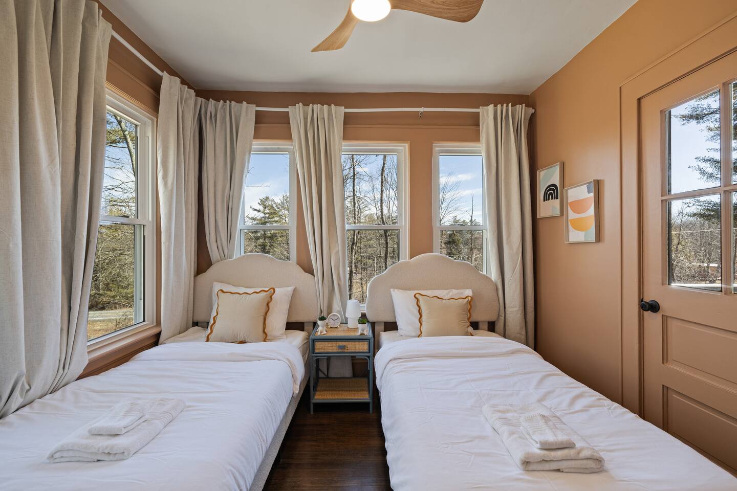 First Floor: Step into a warm and inviting space featuring a cozy living room, a dining area perfect for shared meals, and a fully equipped kitchen stocked with everything you need. A mudroom and laundry room with a washer and dryer add extra convenience, and a half bathroom completes this level. Second Floor: This floor offers two lounge areas, each with a sofa bed, perfect for relaxing or additional sleeping space. You'll find: A room with two twin beds. A room with two full-size beds and a full bathroom, leading into another room with a full-size beds. A red room with a queen-size bed and a private full bathroom, which connects to a room with a twin-on-twin bunk beds. An additional room with a twin bed. Please note: Two back bedrooms on this floor require passage through adjacent rooms for access. Third Floor: This floor also features two lounge areas, each with a sofa bed for extra sleeping space. You'll find: A room with two twin-on-twin bunk beds. A lounge area with a full bathroom and a sofa bed, leading into a room with a queen-size bed. A room with two twin beds. Another lounge area with a full bathroom and a sofa bed, leading into a bedroom with two full-size beds. This spacious home is designed to accommodate groups comfortably, ensuring a memorable and relaxing stay. We look forward to hosting you!
