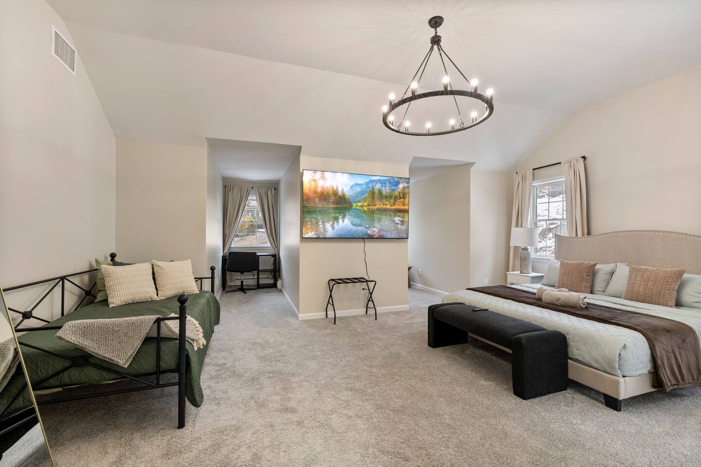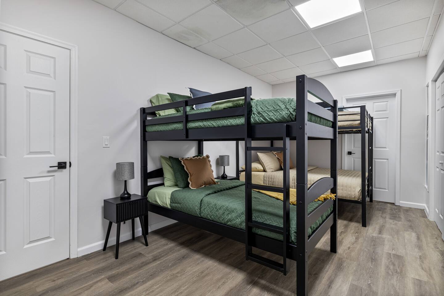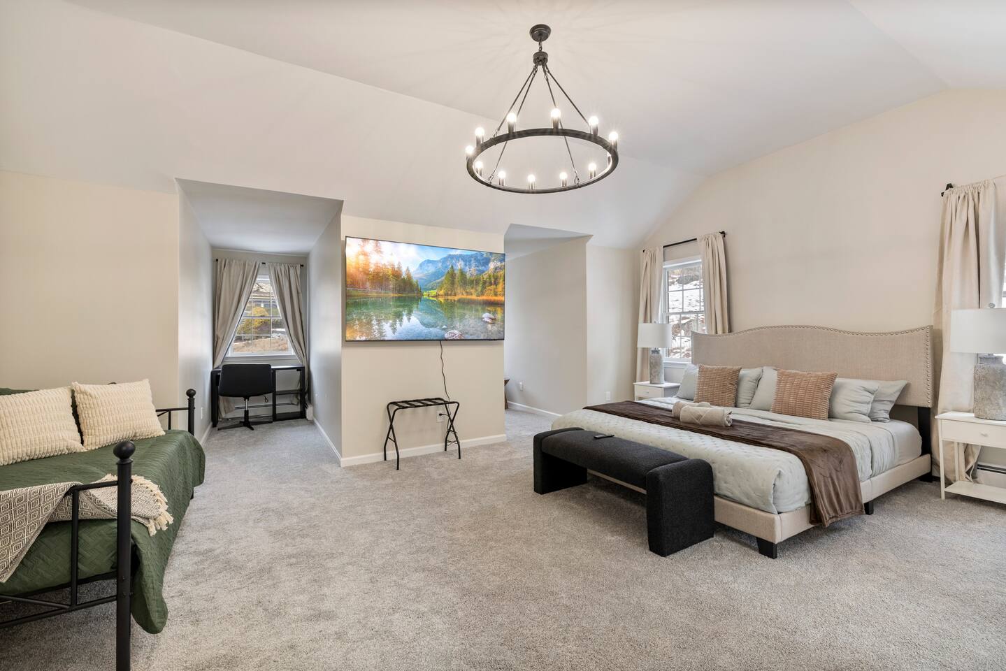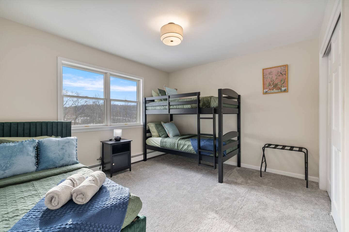 This spacious 9-bedroom, 3.5-bath home is perfect for large groups. The main floor features an open-concept living and dining area with high ceilings, a cozy wood-burning fireplace, a fully equipped kitchen with stainless steel appliances, a game room, a laundry room, and a bedroom with a queen bed. Upstairs, the primary suite includes a king bed, a twin daybed, a sitting area, and an en-suite bathroom with a large shower, jacuzzi tub, and double sinks. Four additional bedrooms are on this floor: one with a queen bed, one with a queen-over-queen bunk bed and a twin bed, one with a twin-over-twin bunk bed and a twin bed, and one with a king bed and a twin bed. A full bathroom is in the hallway. The lower level offers additional space with three more bedrooms: one with two twin beds, another with two twin beds, and a third with a queen-over-queen bunk bed and a twin-over-twin bunk bed. A full bathroom is also on this level. Step outside to enjoy the large deck with outdoor seating, a private hot tub available year-round, and a seasonal in-ground pool with a poolside bar and lounge area. The home also includes a grill for outdoor cooking and scenic mountain views, making it a perfect retreat for families and groups.