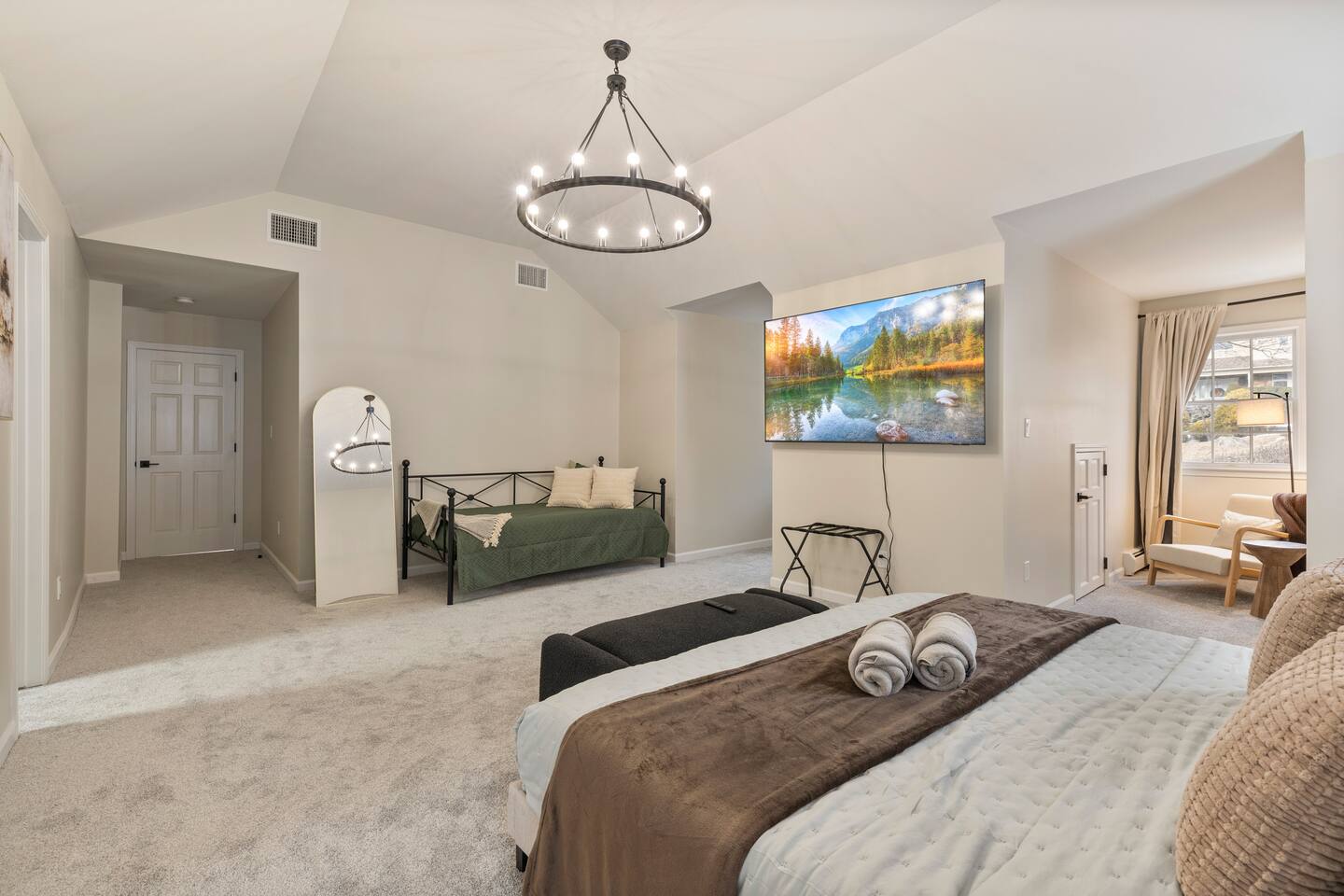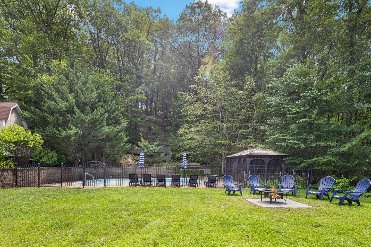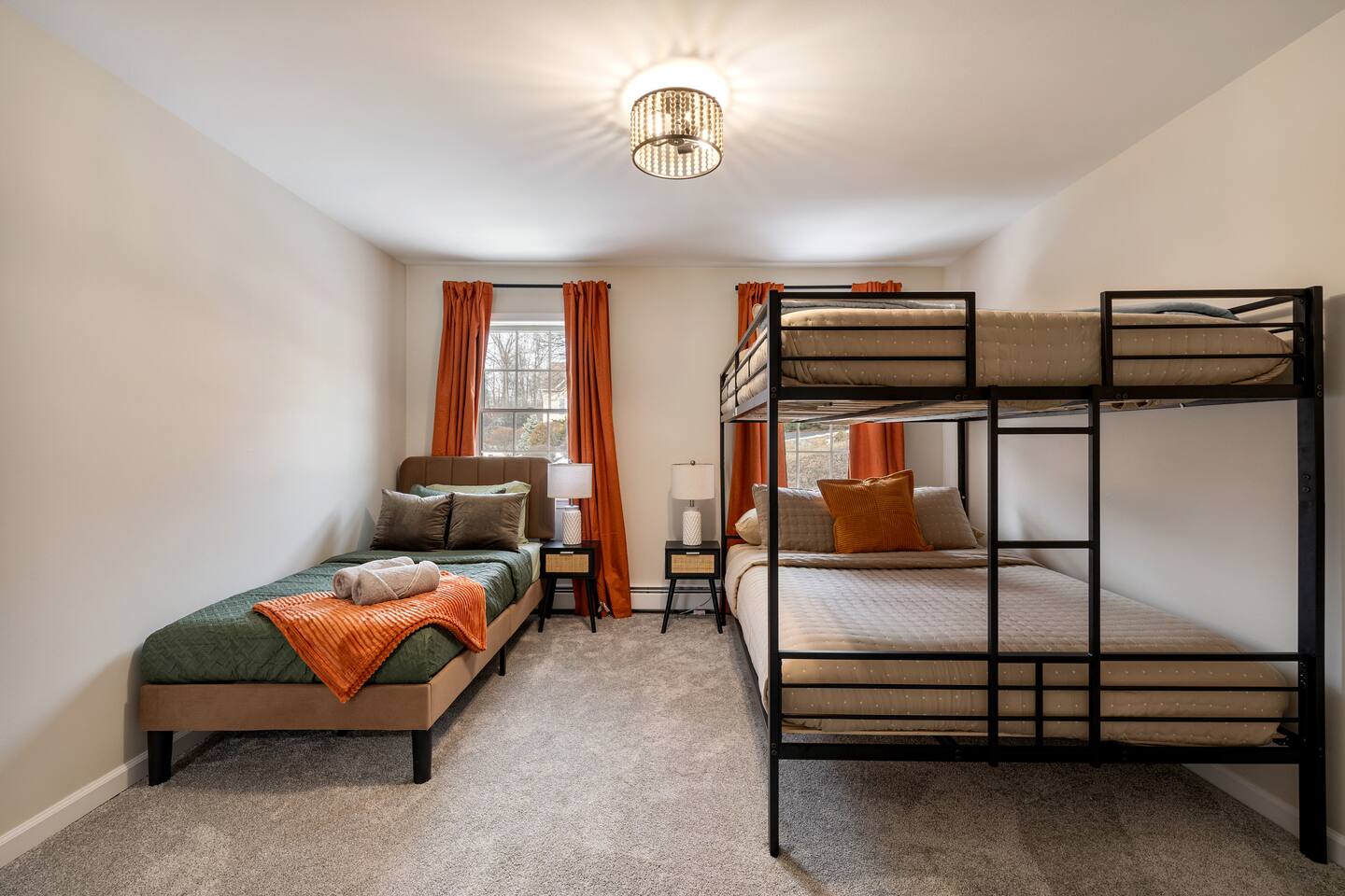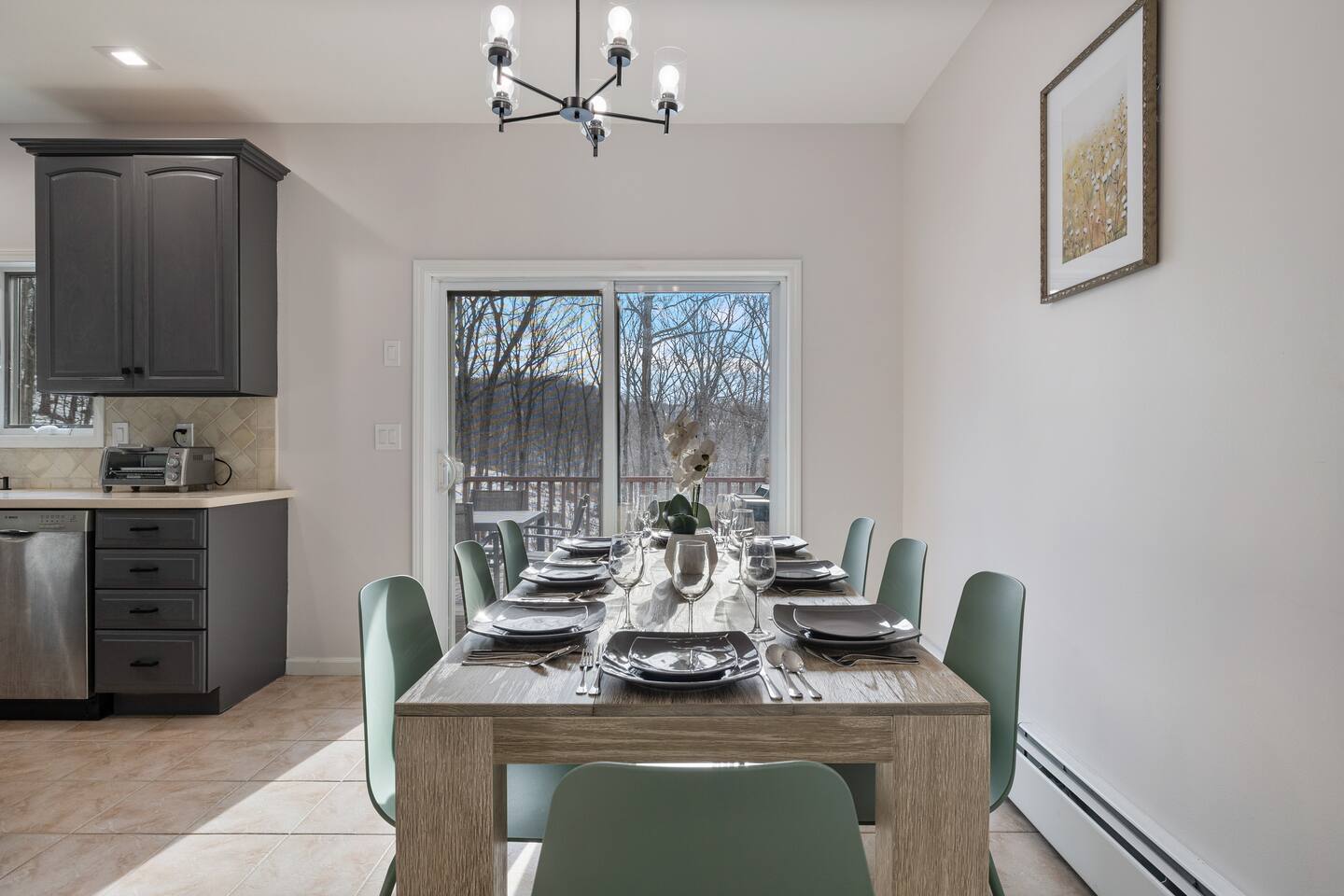 This spacious 9-bedroom, 3.5-bath home is perfect for large groups. The main floor features an open-concept living and dining area with high ceilings, a cozy wood-burning fireplace, a fully equipped kitchen with stainless steel appliances, a game room, a laundry room, and a bedroom with a queen bed. Upstairs, the primary suite includes a king bed, a twin daybed, a sitting area, and an en-suite bathroom with a large shower, jacuzzi tub, and double sinks. Four additional bedrooms are on this floor: one with a queen bed, one with a queen-over-queen bunk bed and a twin bed, one with a twin-over-twin bunk bed and a twin bed, and one with a king bed and a twin bed. A full bathroom is in the hallway. The lower level offers additional space with three more bedrooms: one with two twin beds, another with two twin beds, and a third with a queen-over-queen bunk bed and a twin-over-twin bunk bed. A full bathroom is also on this level. Step outside to enjoy the large deck with outdoor seating, a private hot tub available year-round, and a seasonal in-ground pool with a poolside bar and lounge area. The home also includes a grill for outdoor cooking and scenic mountain views, making it a perfect retreat for families and groups.