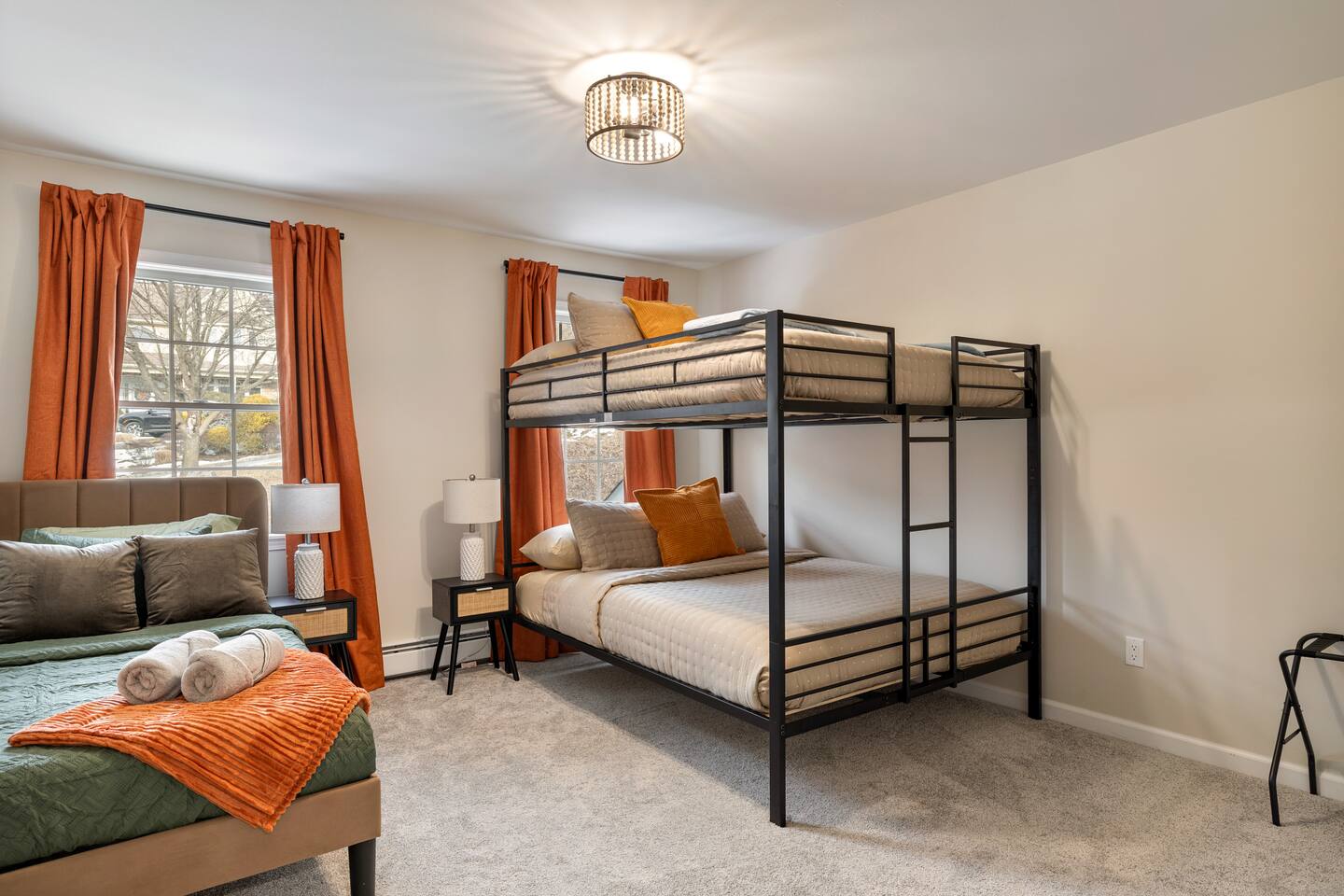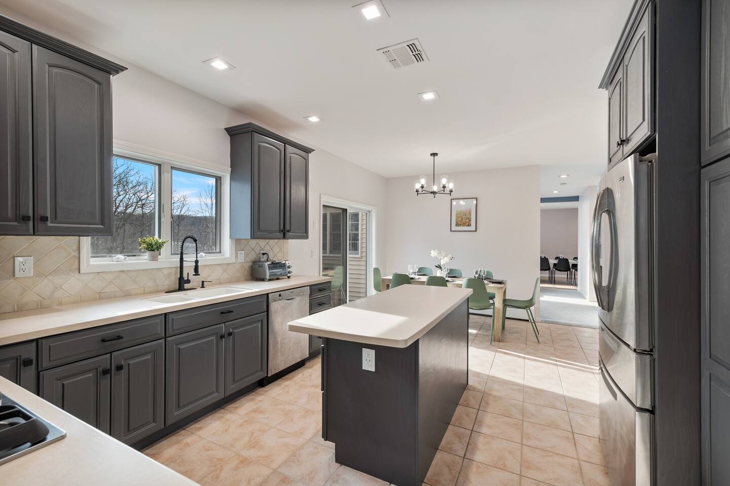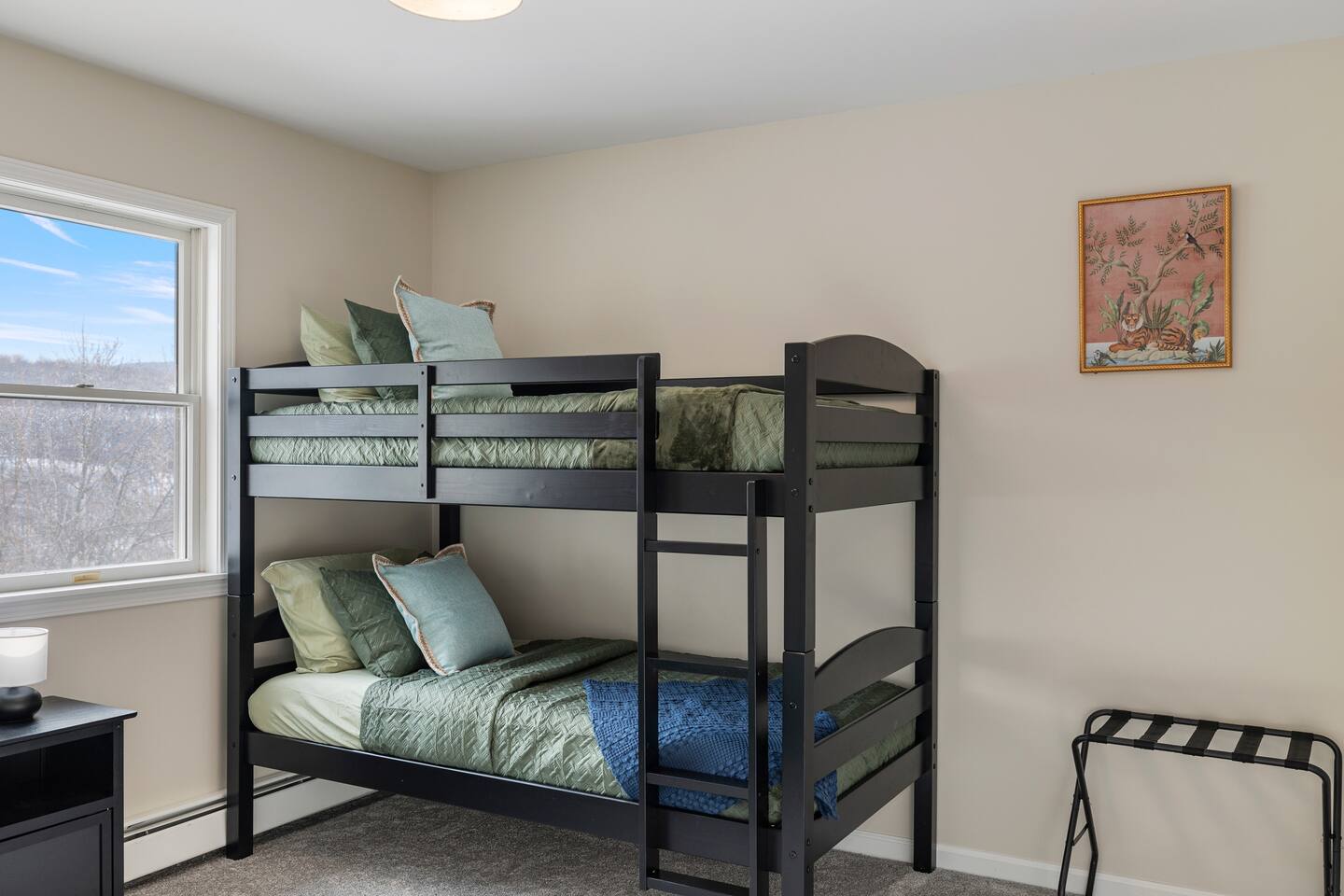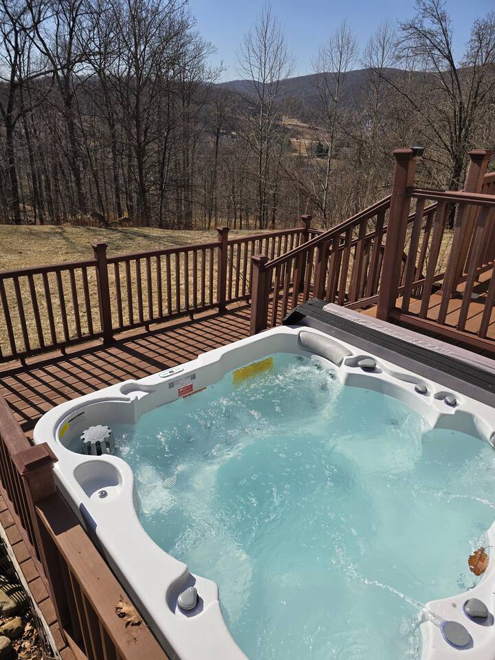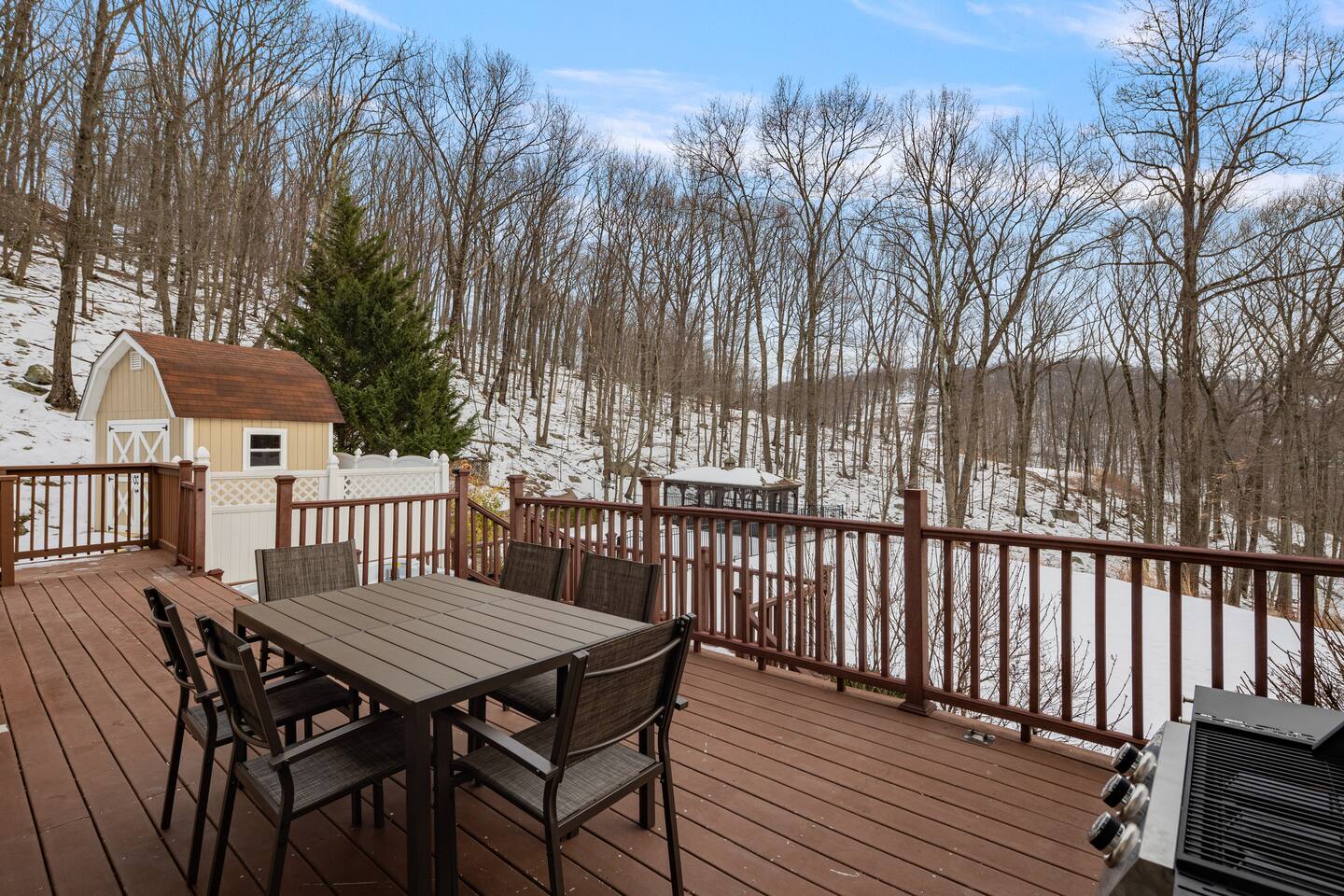 This spacious 9-bedroom, 3.5-bath home is perfect for large groups. The main floor features an open-concept living and dining area with high ceilings, a cozy wood-burning fireplace, a fully equipped kitchen with stainless steel appliances, a game room, a laundry room, and a bedroom with a queen bed. Upstairs, the primary suite includes a king bed, a twin daybed, a sitting area, and an en-suite bathroom with a large shower, jacuzzi tub, and double sinks. Four additional bedrooms are on this floor: one with a queen bed, one with a queen-over-queen bunk bed and a twin bed, one with a twin-over-twin bunk bed and a twin bed, and one with a king bed and a twin bed. A full bathroom is in the hallway. The lower level offers additional space with three more bedrooms: one with two twin beds, another with two twin beds, and a third with a queen-over-queen bunk bed and a twin-over-twin bunk bed. A full bathroom is also on this level. Step outside to enjoy the large deck with outdoor seating, a private hot tub available year-round, and a seasonal in-ground pool with a poolside bar and lounge area. The home also includes a grill for outdoor cooking and scenic mountain views, making it a perfect retreat for families and groups.