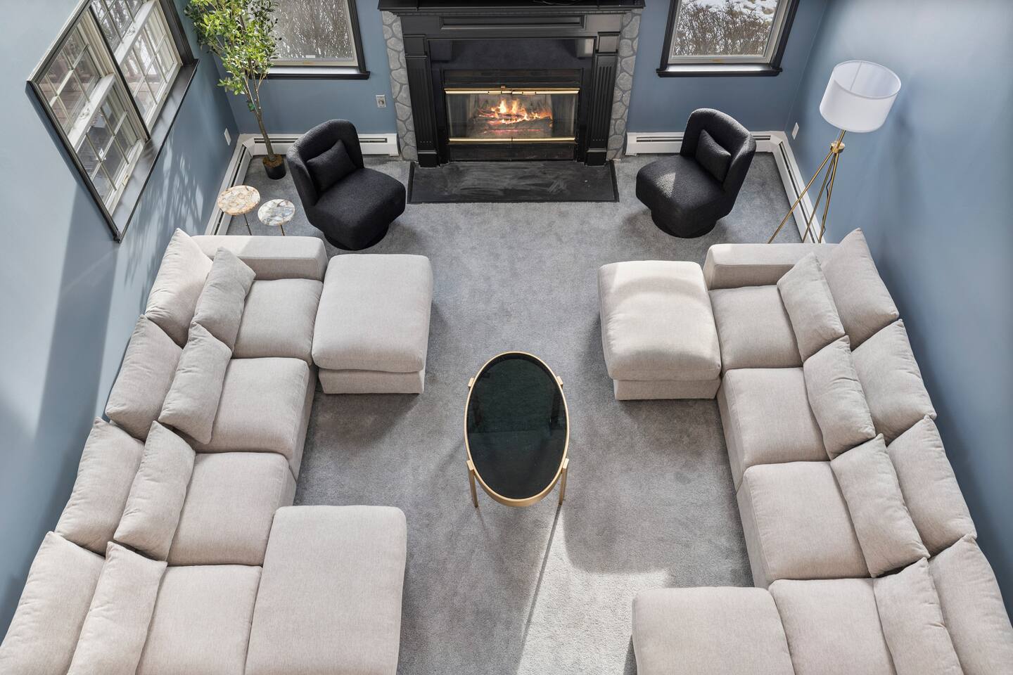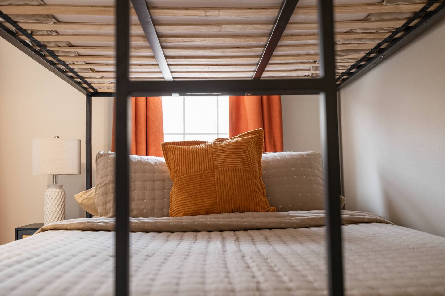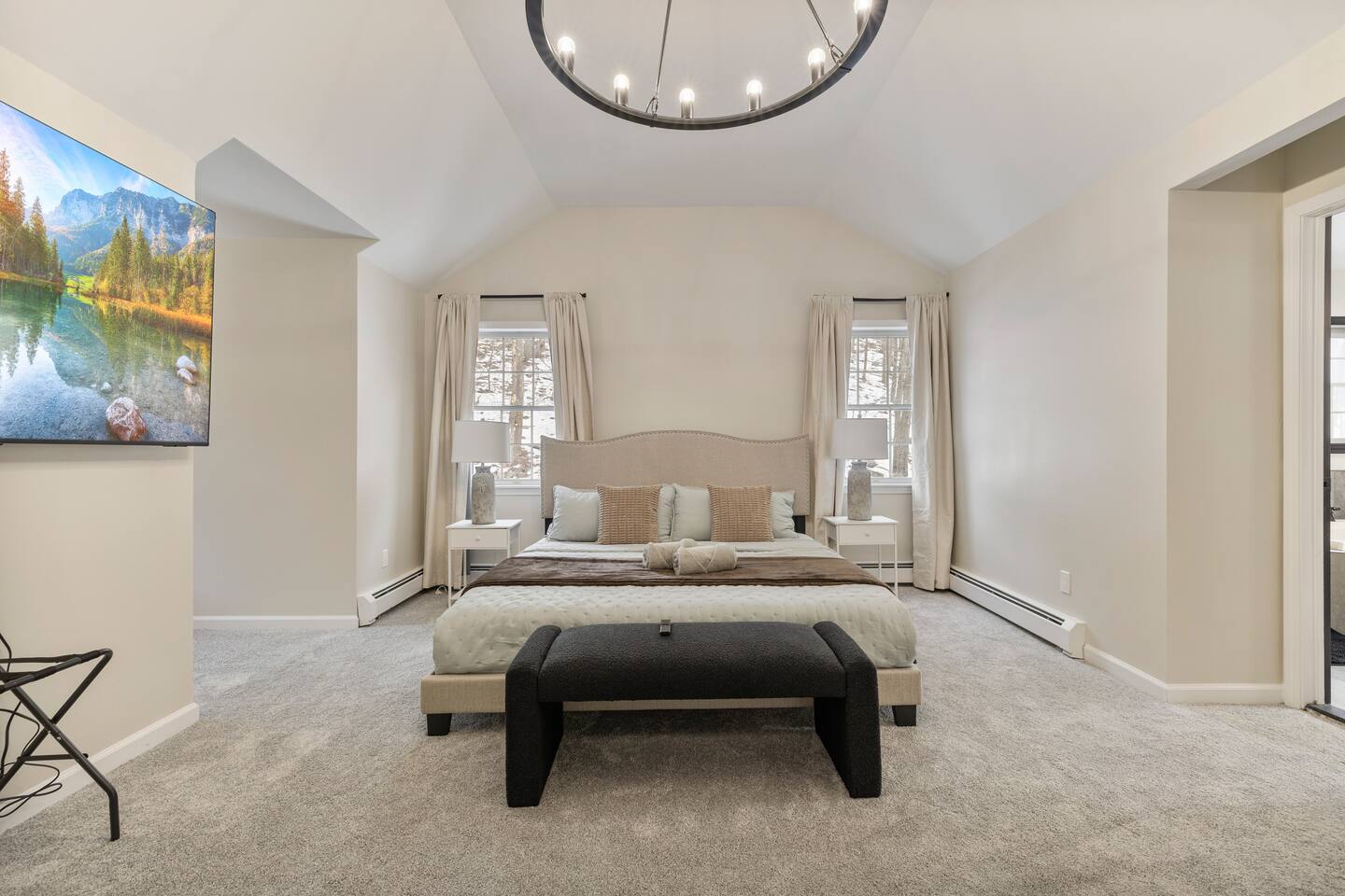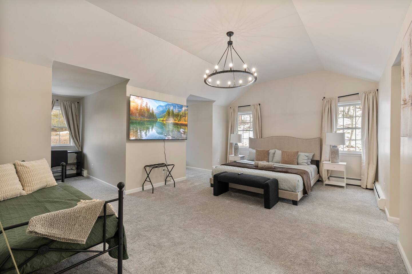 This spacious 9-bedroom, 3.5-bath home is perfect for large groups. The main floor features an open-concept living and dining area with high ceilings, a cozy wood-burning fireplace, a fully equipped kitchen with stainless steel appliances, a game room, a laundry room, and a bedroom with a queen bed. Upstairs, the primary suite includes a king bed, a twin daybed, a sitting area, and an en-suite bathroom with a large shower, jacuzzi tub, and double sinks. Four additional bedrooms are on this floor: one with a queen bed, one with a queen-over-queen bunk bed and a twin bed, one with a twin-over-twin bunk bed and a twin bed, and one with a king bed and a twin bed. A full bathroom is in the hallway. The lower level offers additional space with three more bedrooms: one with two twin beds, another with two twin beds, and a third with a queen-over-queen bunk bed and a twin-over-twin bunk bed. A full bathroom is also on this level. Step outside to enjoy the large deck with outdoor seating, a private hot tub available year-round, and a seasonal in-ground pool with a poolside bar and lounge area. The home also includes a grill for outdoor cooking and scenic mountain views, making it a perfect retreat for families and groups.